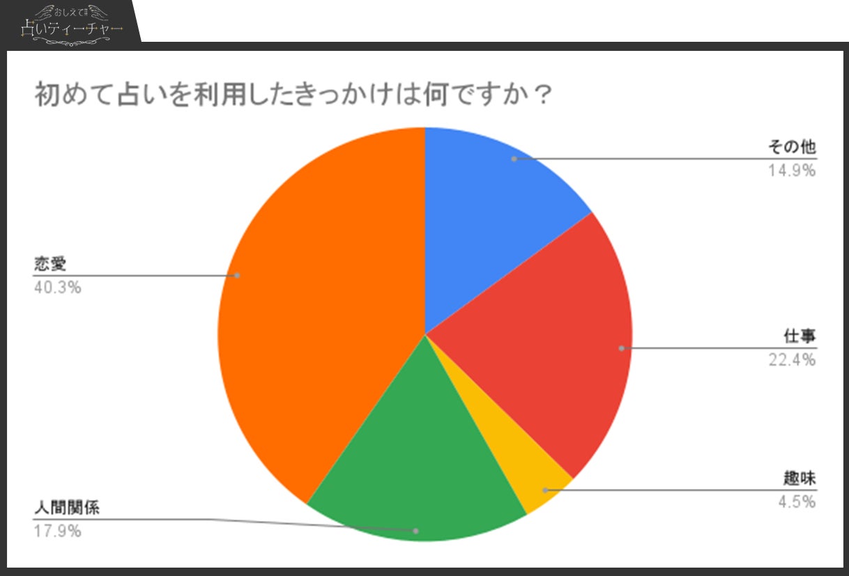 アンケート結果から、初めて占いを利用したきっかけとして「恋愛」が最も多く(40.3%)、次いで「仕事」(22.4%)、「人間関係」(17.9%)が続きました。恋愛や仕事、人間関係の悩みが占いを試す主な動機となっており、特に具体的な課題解決や心理的な支えを求める傾向が強いことが分かります。一方で、「趣味」として占いを始めた人は少数派(4.5%)で、占いは主に実用的な目的で利用されていると言えます。