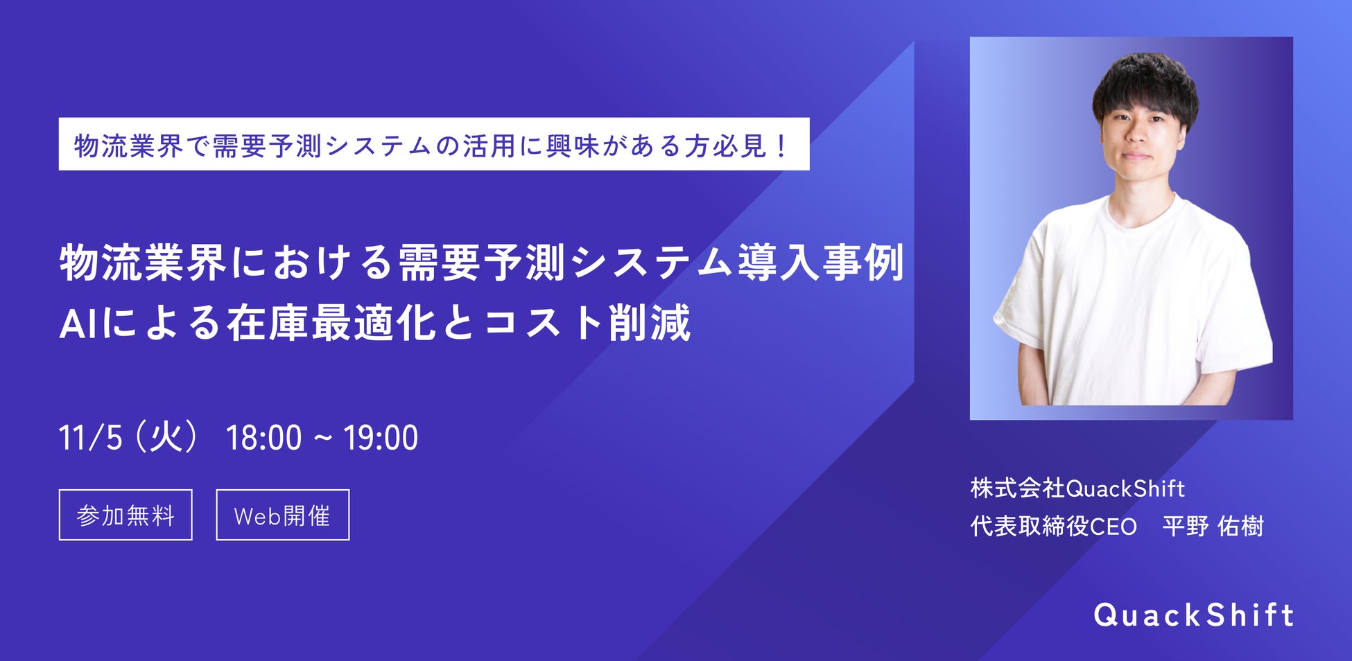 株式会社QuackShiftは、「物流業界における需要予測システム導入事例:AIによる在庫最適化とコスト削減」をテーマにしたウェビナーを開催いたします。