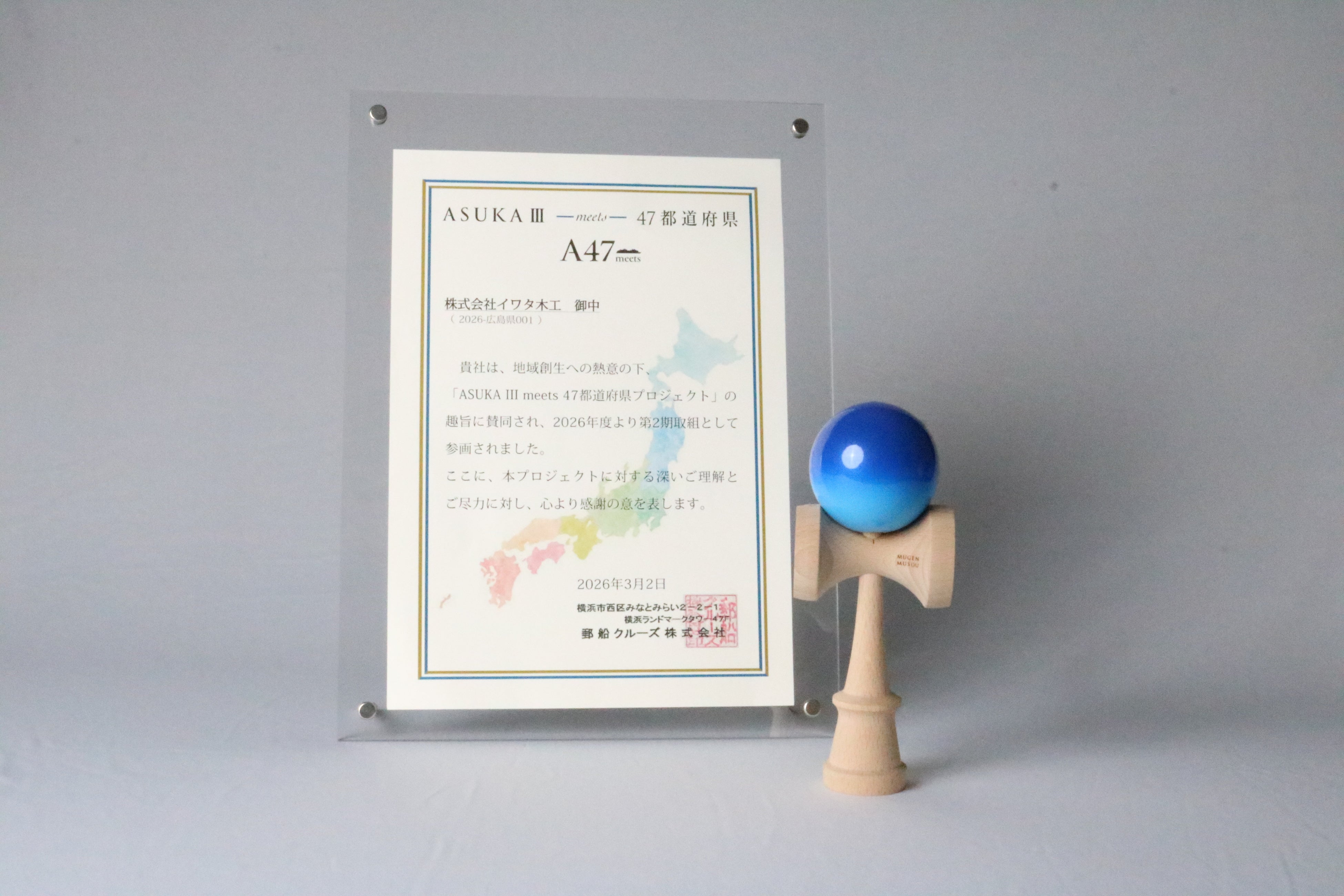 郵船クルーズ株式会社が運航する客船「飛鳥Ⅲ」で実施されている「ASUKA Ⅲ meets 47都道府県プロジェクト」において、株式会社イワタ木工(本社:広島県廿日市市、代表取締役社長:岩田知真)が展開するけん玉ブランド「MUGEN MUSOU」より、「Hiroshima Like」シリーズの「Setouchi Blue」と「Sakura Pink」が採用されました。
