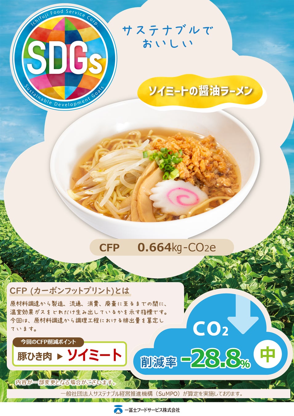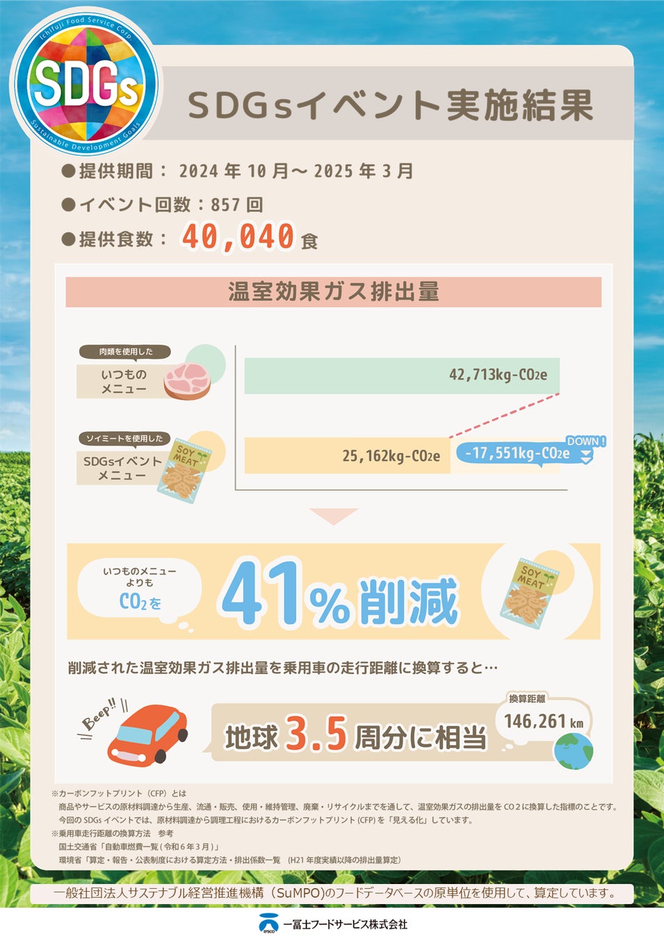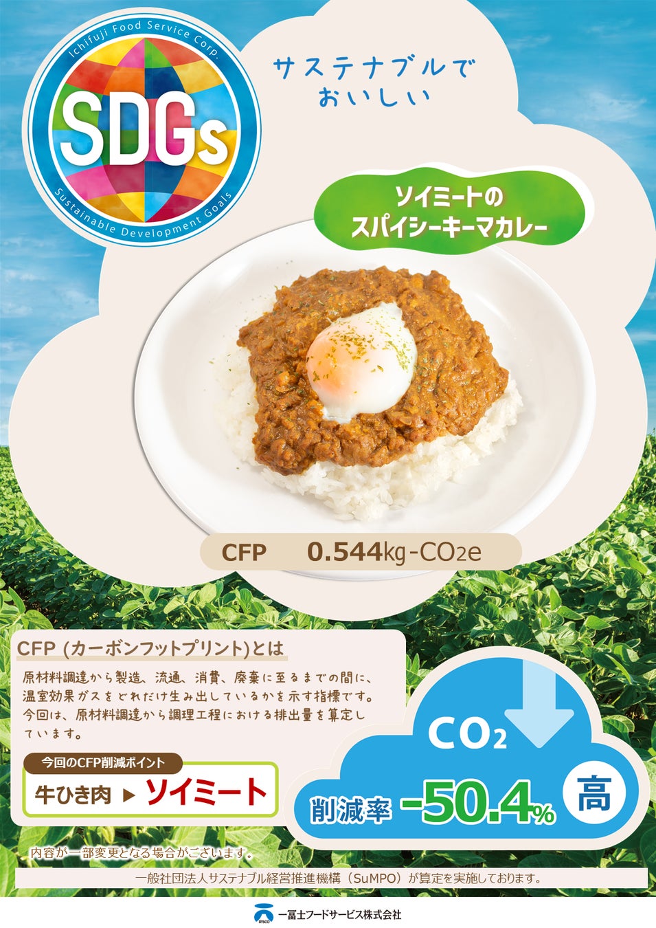 一冨士フードサービス株式会社(本社:大阪市北区 代表取締役社長:大西 博史、以下「当社」)は、2024年10月から2025年3月にかけて、サステナブルなメニューで「カーボンフットプリント(CFP)」を表示するSDGsイベントを実施いたしました。本イベントは、使用する食材を肉類からソイミートなどの環境に配慮した食材を使用した場合に、原材料調達から調理工程において排出されるカーボンフットプリント(CFP)の削減率を「見える化」しています。(詳細はこちらから)