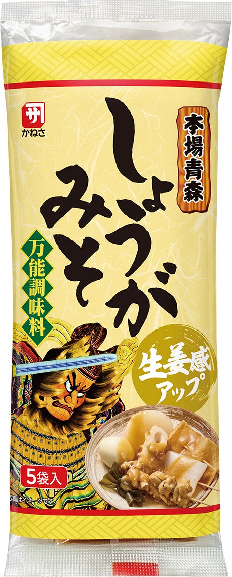 国産しょうがの香りと甘みにこだわりました。素材本来の味を楽しめるように、うま味調味料を使っていません。旨みと甘みを引き出す煮切り本みりんを使用。青森名物「しょうがみそおでん」のほか、さばの味噌煮やしょうが焼きなど、さまざまな料理にアレンジできる、万能しょうがみそです。新発売のスパウトタイプ「かねさ 万能しょうがみそ」と、小分けで便利な5袋入り「かねさ 本場青森しょうがみそ」は生姜感をアップしました。