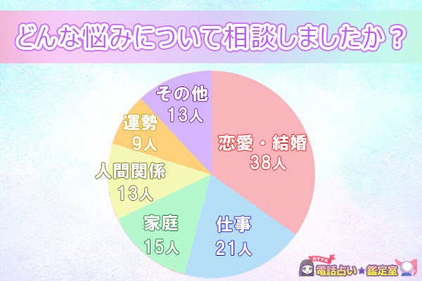 悩みの内容としては、最も多かったのが「恋愛・結婚について」で38人、次いで「仕事について」が21人、「家庭について」が15人と続きます。