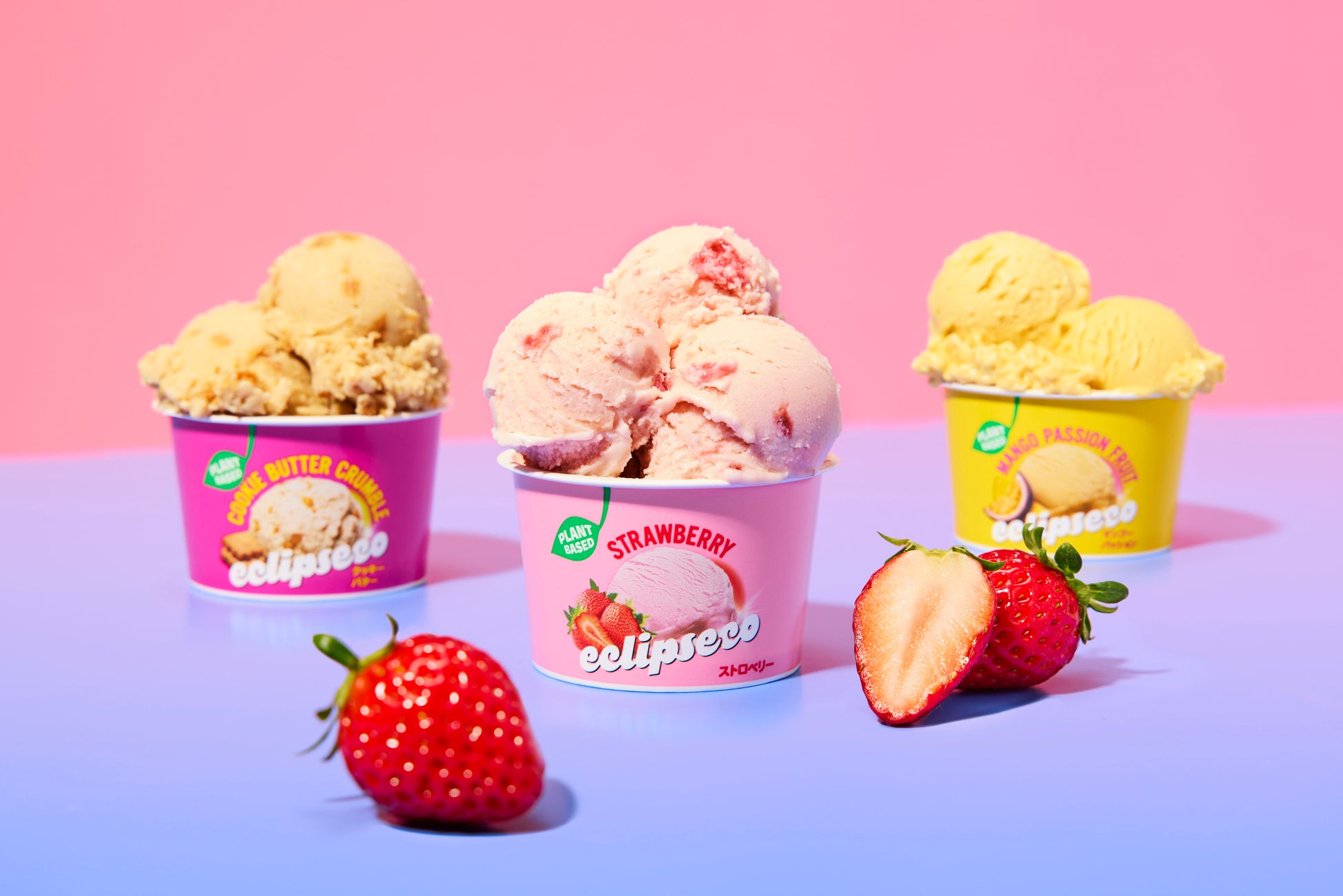 今回の展開では、定番の人気商品「クッキーバター」「マンゴーパッション」に加え、日本限定のフレーバーとなる新作「ストロベリー」を発売。「eclipseco(エクリプスコ)」のクリーミーな味わいにいちごの甘い香りと爽やかな酸味が加わり、濃厚でありながらさっぱりとした口当たりのストロベリーアイスに仕上がりました。原料に国産のいちごピューレを使用し、日本向けに特別に開発された限定フレーバーとなっています。