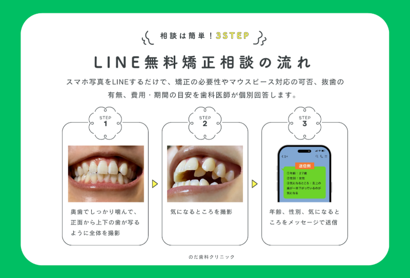 スマホ写真をLINEするだけで、矯正の必要性やマウスピース対応の可否、抜歯の有無、費用・期間の目安を歯科医師が個別回答します。