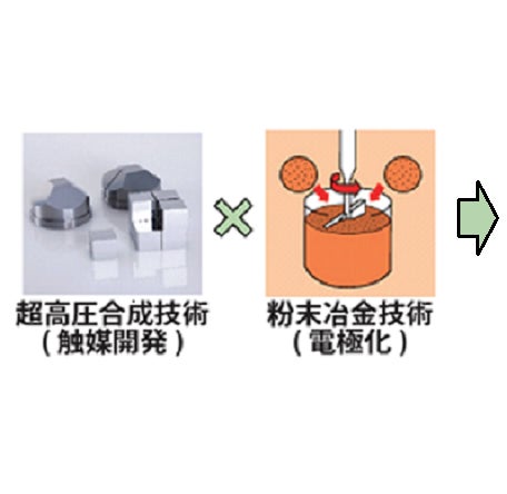 【PME】の開発は、もともと当社が高圧工具を製造する技術を持っていたことから、「超高圧発生技術を応用すれば触媒を作ることができるのではないか」という発想でスタートしました。本製品は、当社のコア技術である粉末冶金技術を活用した材料設計と、新しく開発した高性能触媒を電極内に組み込むことで、従来品を上回る性能を実現しました。高性能触媒は、当社の高圧工具を用いて合成しており、当社の技術を結集した新製品です。詳細につきましては、弊社コーポレートサイト掲載のリーフレットをご覧ください。