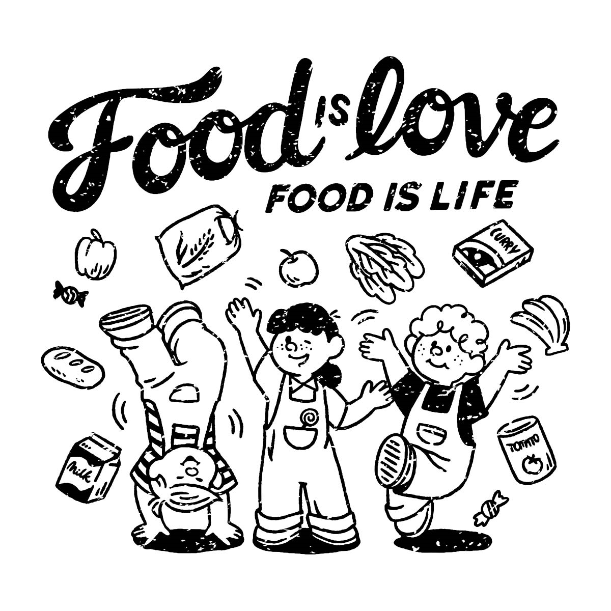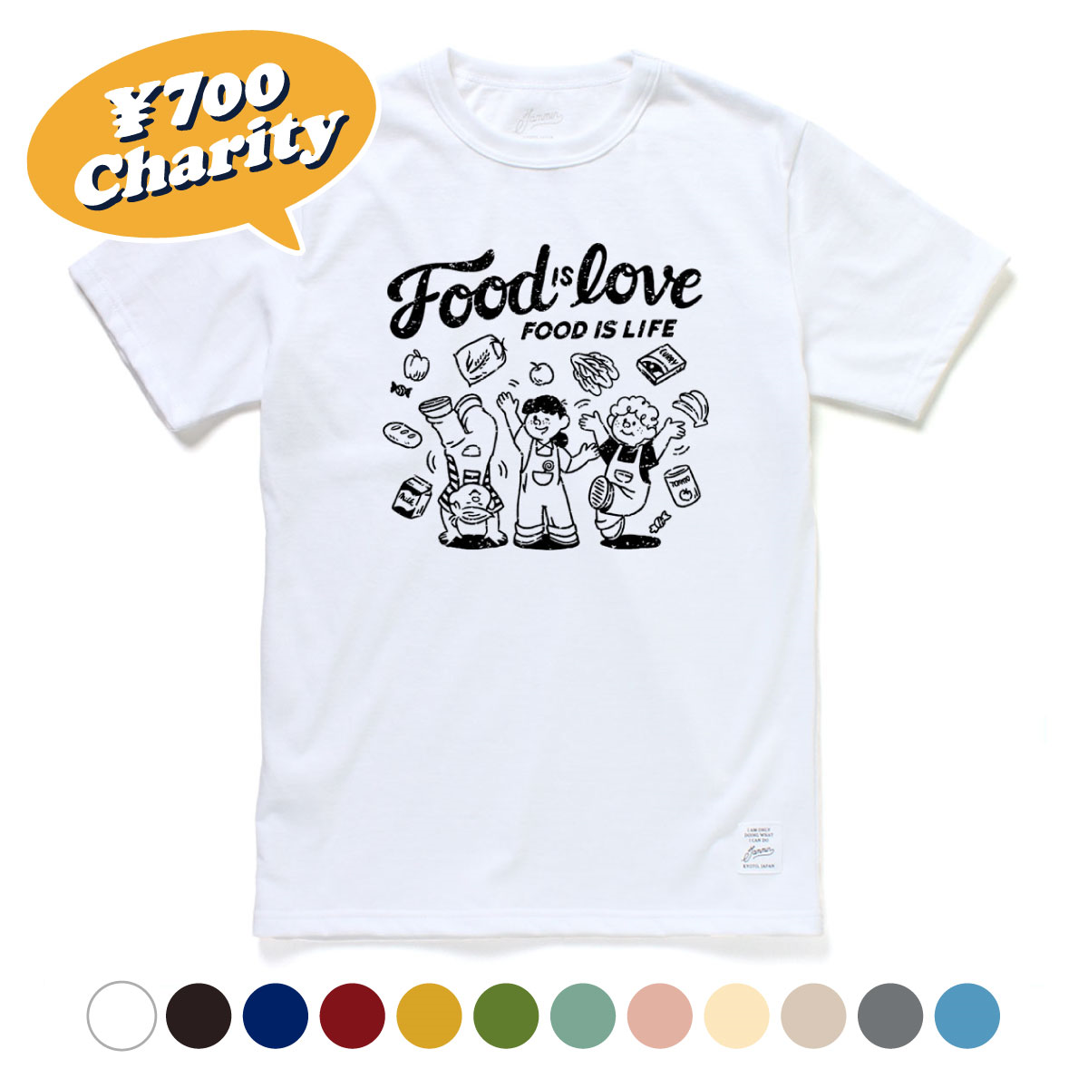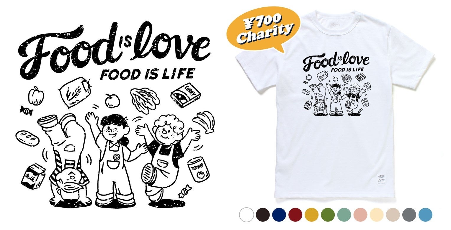JAMMINのオリジナルデザインは、ファッションアイテムとして「街で着られる」をコンセプトに、デザインを制作しています。また、コラボデザインのコンセプトは「食は、生きる尊厳」。いろんな食べものに囲まれて楽しそうにはしゃぐ人の姿を描き、どんな時でも、必要な食にアクセスできることは生きる尊厳を守ることであり、それによって人に力が湧いてくる様子を表現しています。
