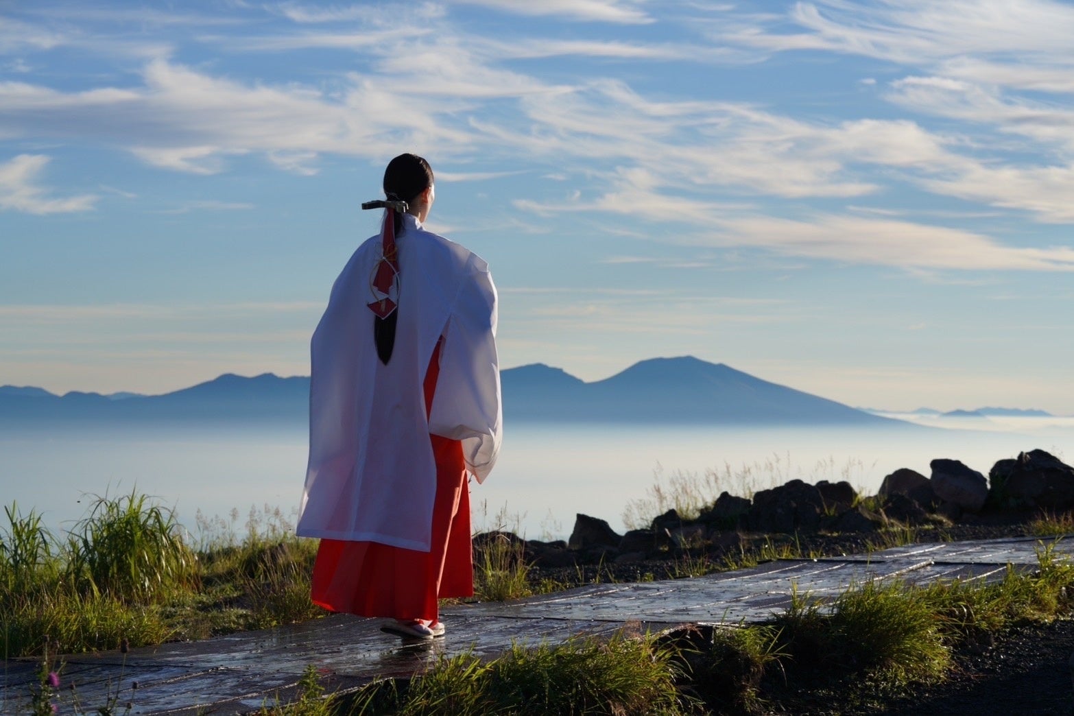 諏訪市、茅野市をまたぐ霧ヶ峰山頂1925mに鎮座する天空の社・車山神社で、 縄文の祈りを受け継ぎ、全国の山の恵みと登山者の安全、海の豊穣を祈念する神事を執り行います。