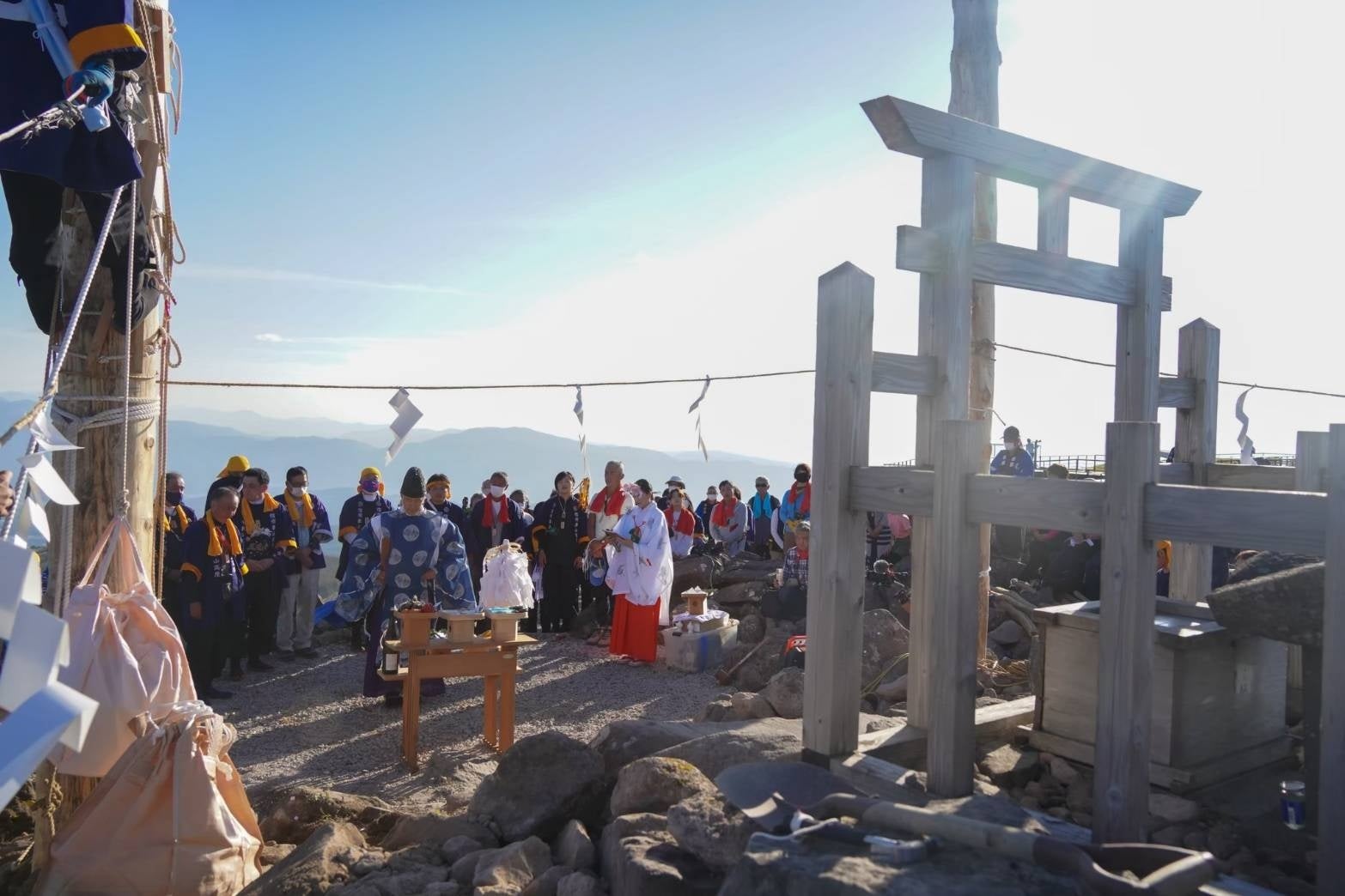 厳粛な神事: 車山神社の神職と巫女による、全国の山々の平安、登山者の安全、海の豊穣を祈る神聖な儀式。縄文時代から続く祈りの伝統を体感できます。