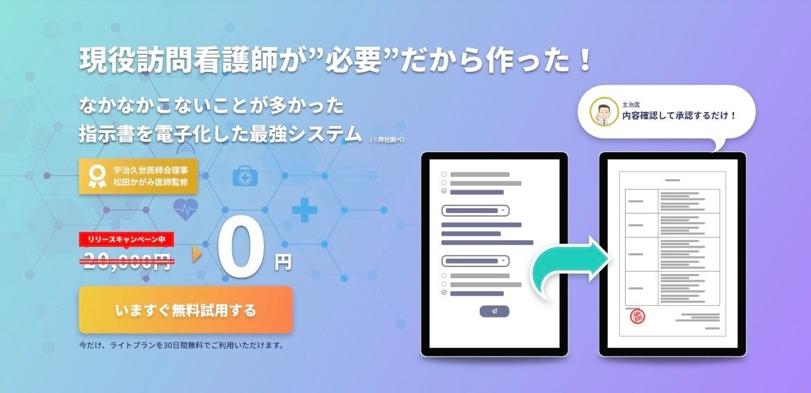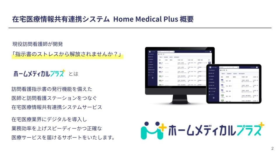 訪問医療に特化した、(京都府宇治市)まつだ在宅クリニックの医院長 松田かがみ先生に監修いただいた、訪問看護指示書発行システム『ホームメディカルプラス(めどぷら)』は販売以降、リリース直後にも関わらず、多くの訪問看護ステーション並び、医師・訪問看護師の皆様にたくさんの反響をいただいております。