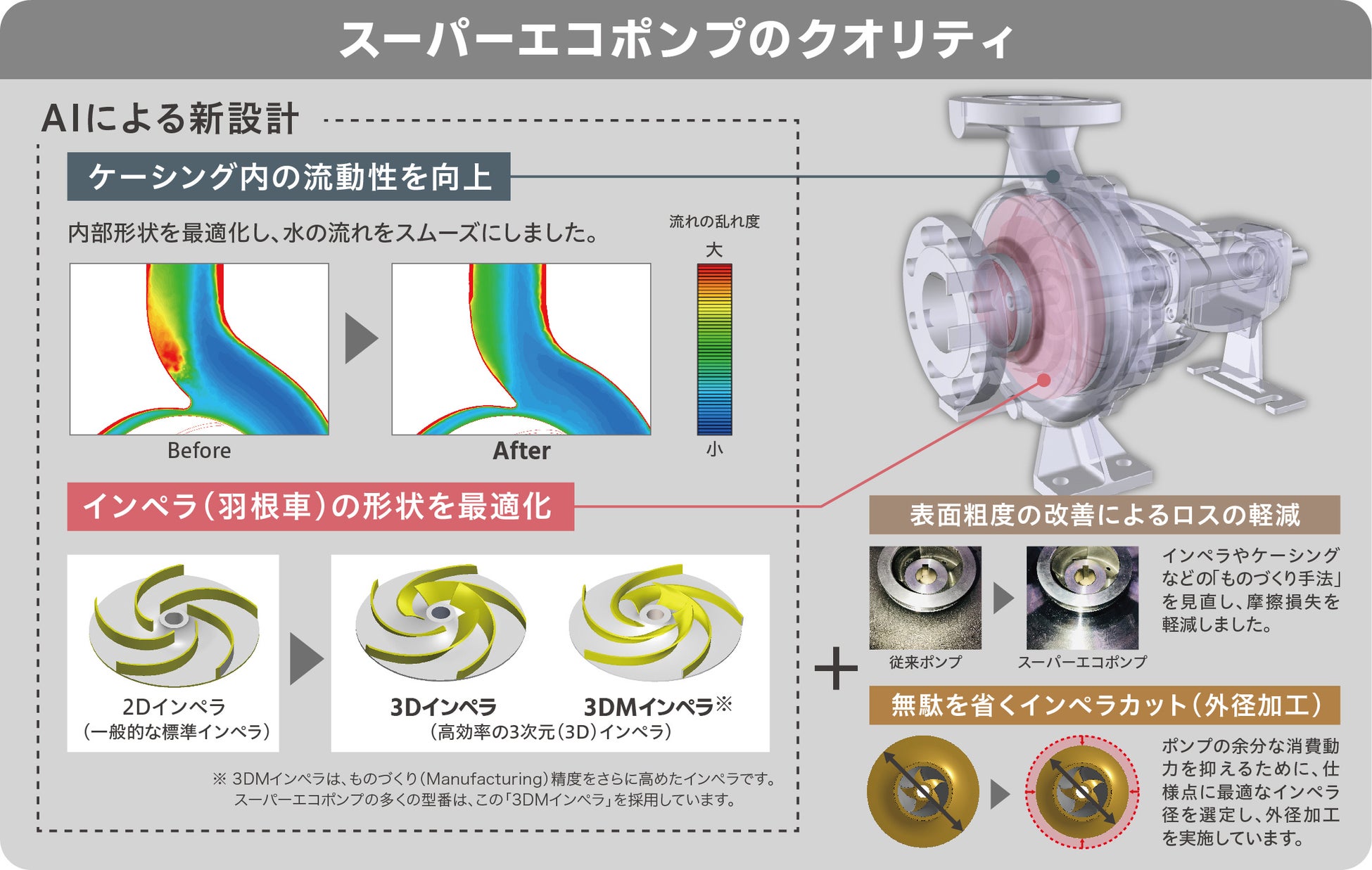 本ポンプは、従来のエコポンプだけではなく、トリシマがこれまで培ってきた、徹底的に高効率を求められる高圧ポンプや大型ポンプの膨大な水力データをAIに学習させることで、新たな設計データを生み出し、より高性能な製品開発につなげ、従来品より大幅に向上したポンプ効率を実現しています。