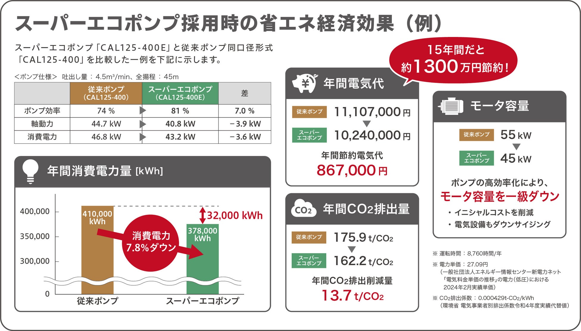 ポンプの高効率化によって消費電力を抑えることができる本ポンプを使用することで、電気代の節約、CO2排出量の削減、モータ容量のダウンサイジングなどが可能となり、お客様の工場などの省エネ課題の解決に貢献することができます。