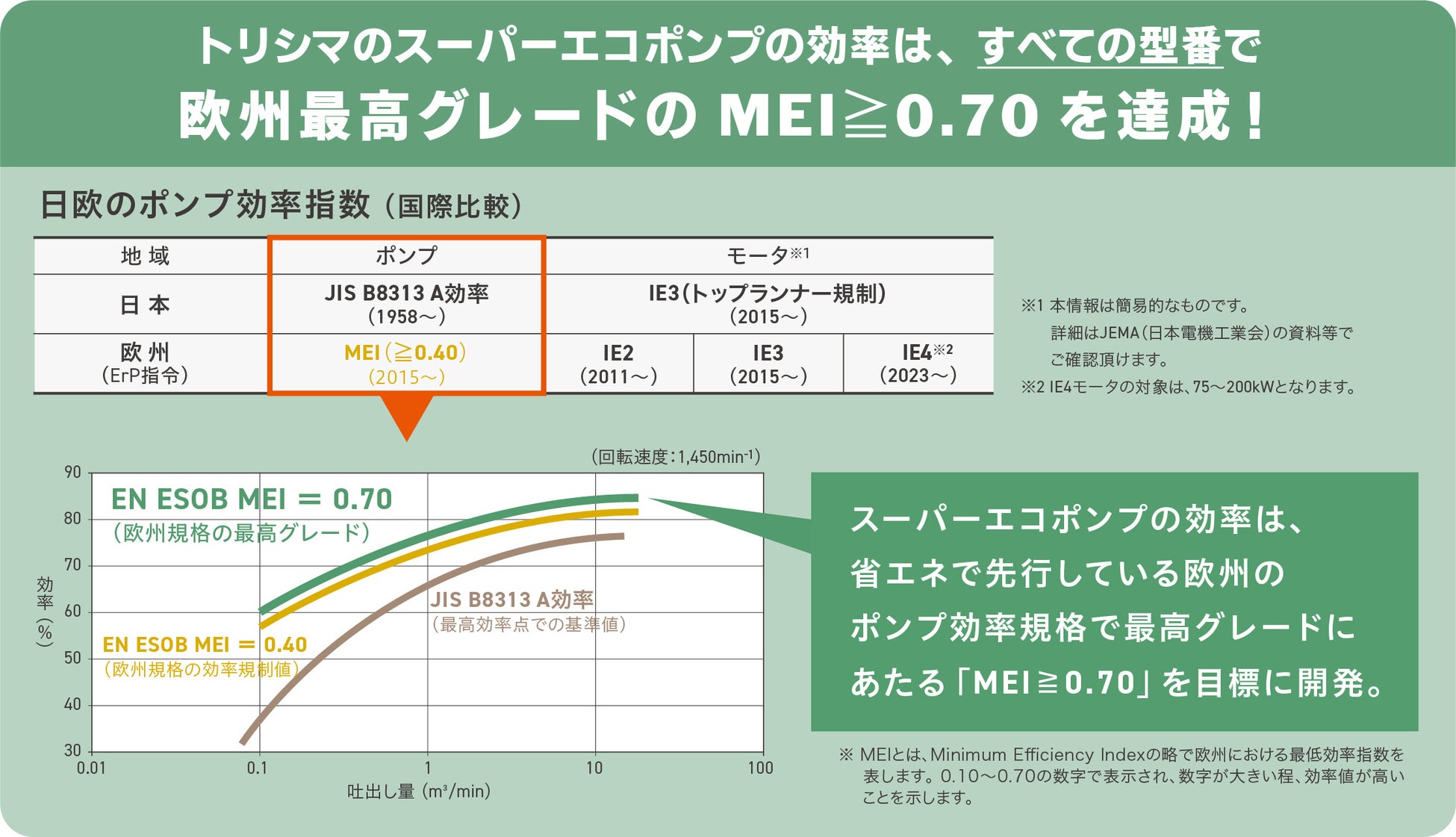 *Minimum Efficiency Indexの略で欧州における最低効率指数を表します。MEIは0.10〜0.70の数字で表示され、数字が大きい程、効率値が高いことを示します。EU指令の下、業界団体によってEU域内に流通しているポンプを対象とした効率値情報の統計がとられました。これをベースに数値化分類したものが、MEI値です。