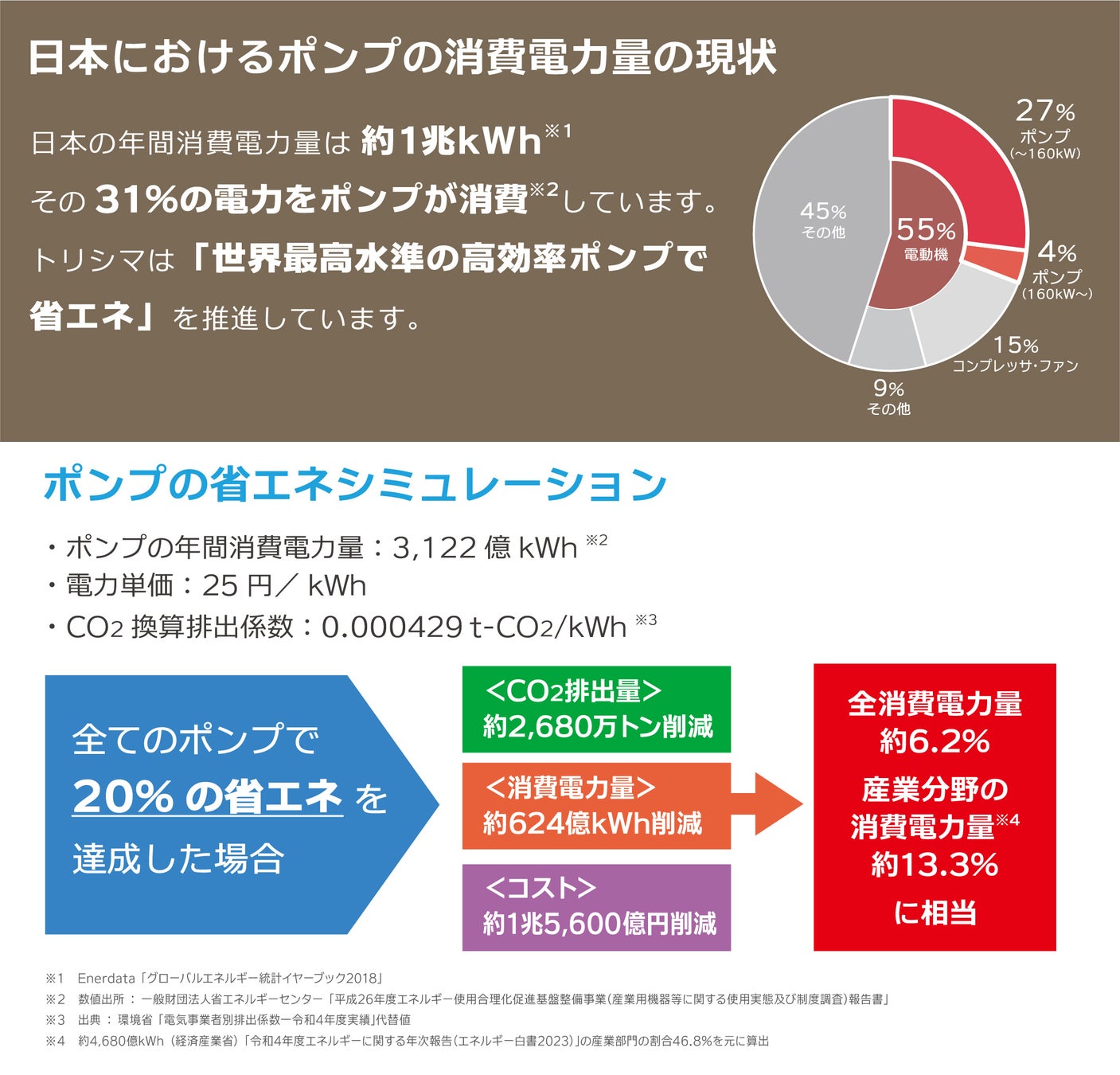 実際にポンプは日本の年間消費電力量の31%を占めています。つまりポンプで省エネを図ることは日本全体の消費電力量を削減でき、CO2排出量の削減にも大きく寄与します。