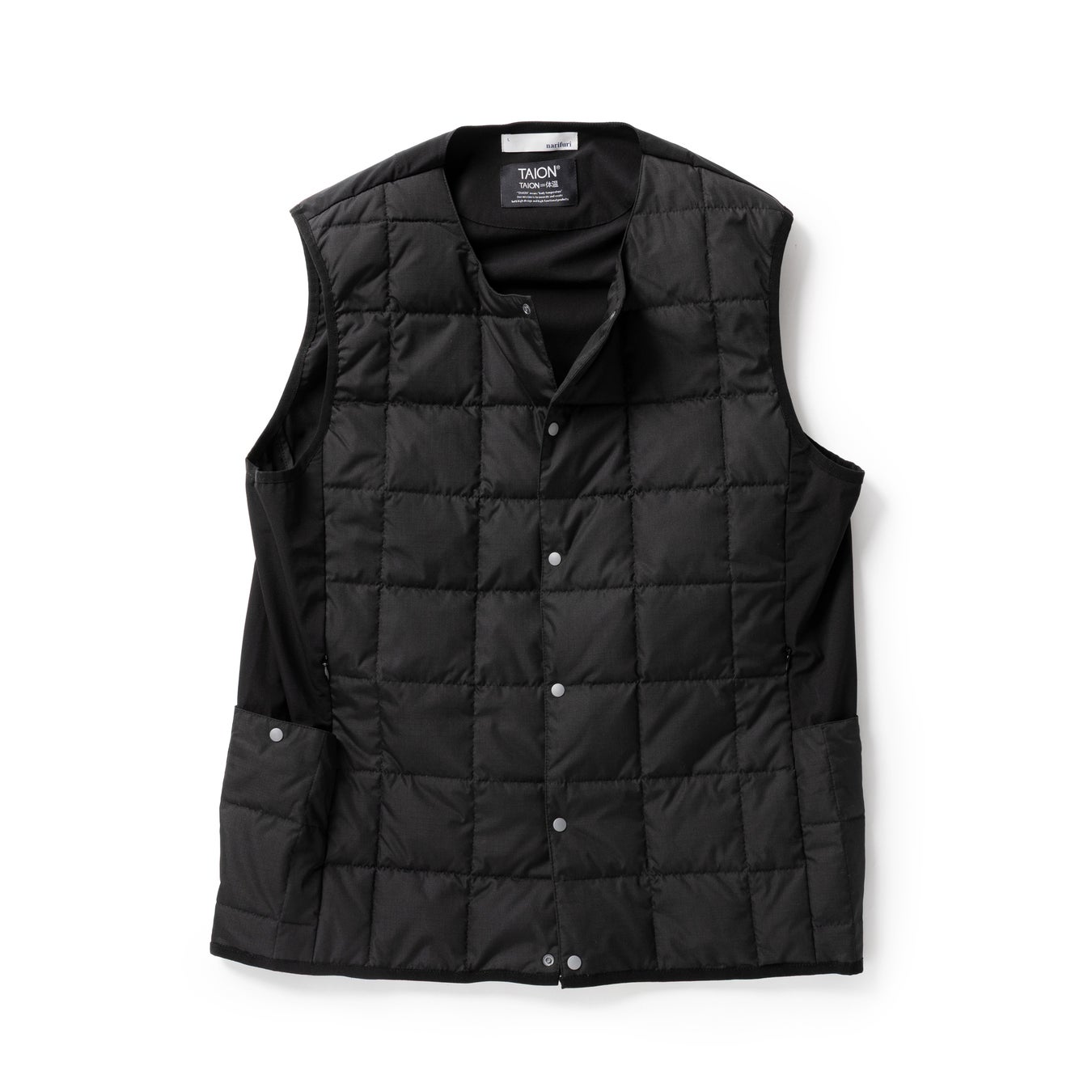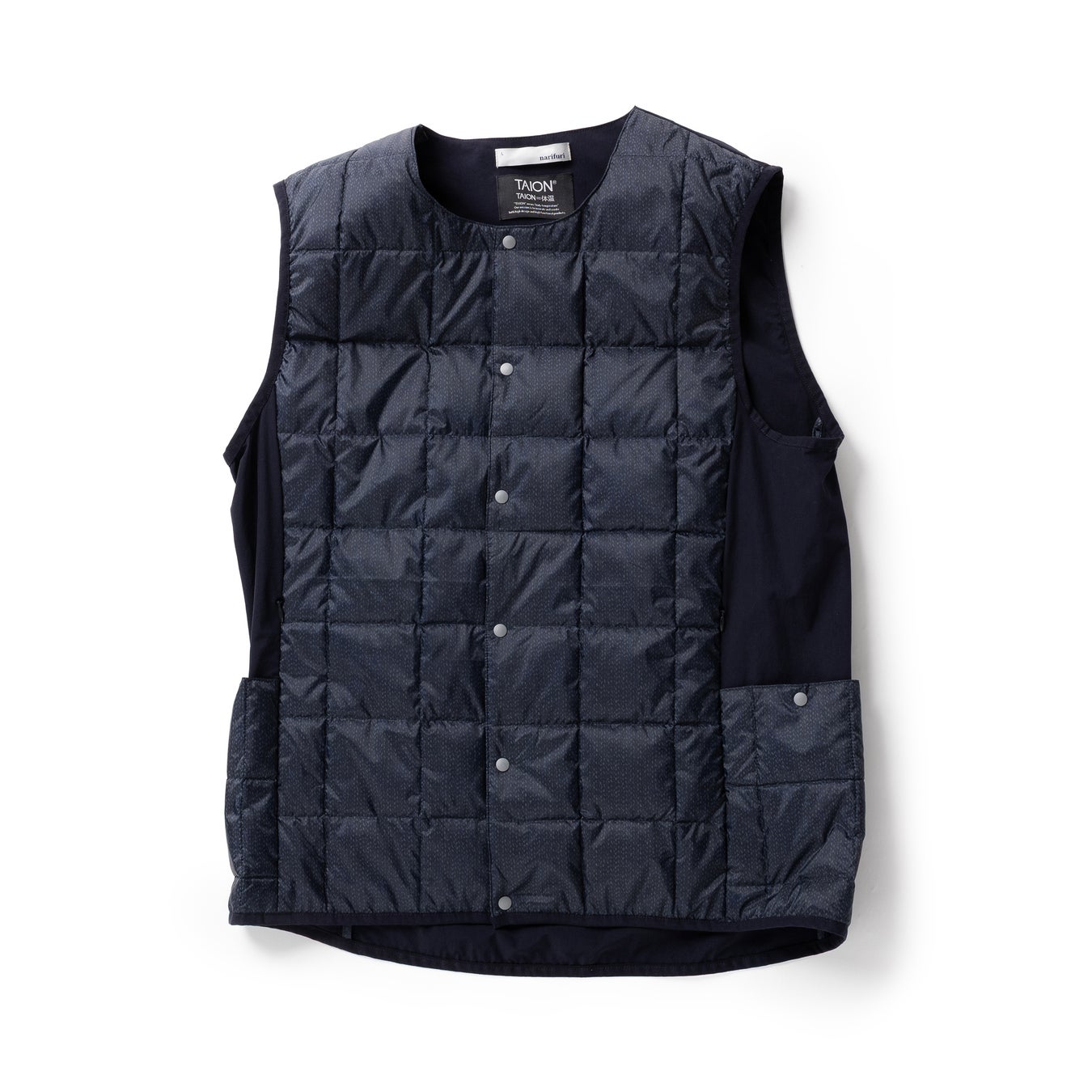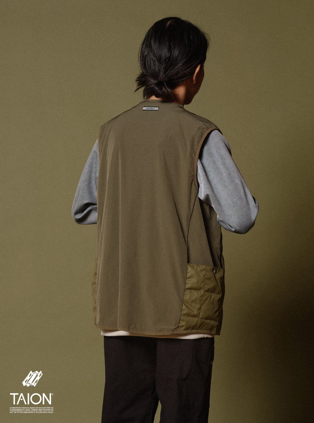 注目すべきは、これまでのコラボレーションで高い評価を得てきたnarifuri×TAIONのアイコニックな”背抜き”仕様のインナーダウンベストのアップデートです。