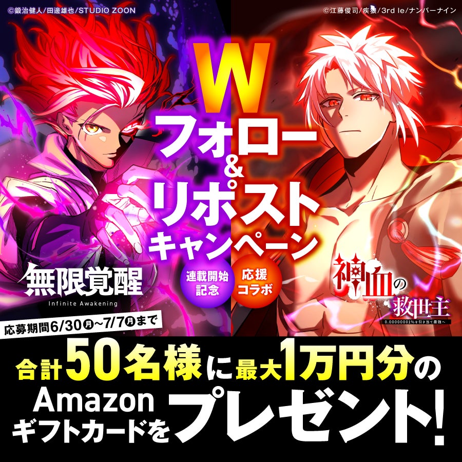 株式会社ナンバーナインの人気作『神血の救世主』とのコラボキャンペーンを開始いたします。『無限覚醒』『神血の救世主』の2つの公式Xアカウントをフォロー&リポストしてくださった方の中から抽選で合計50名様に最大1万円分のAmazonギフトカードをプレゼント。