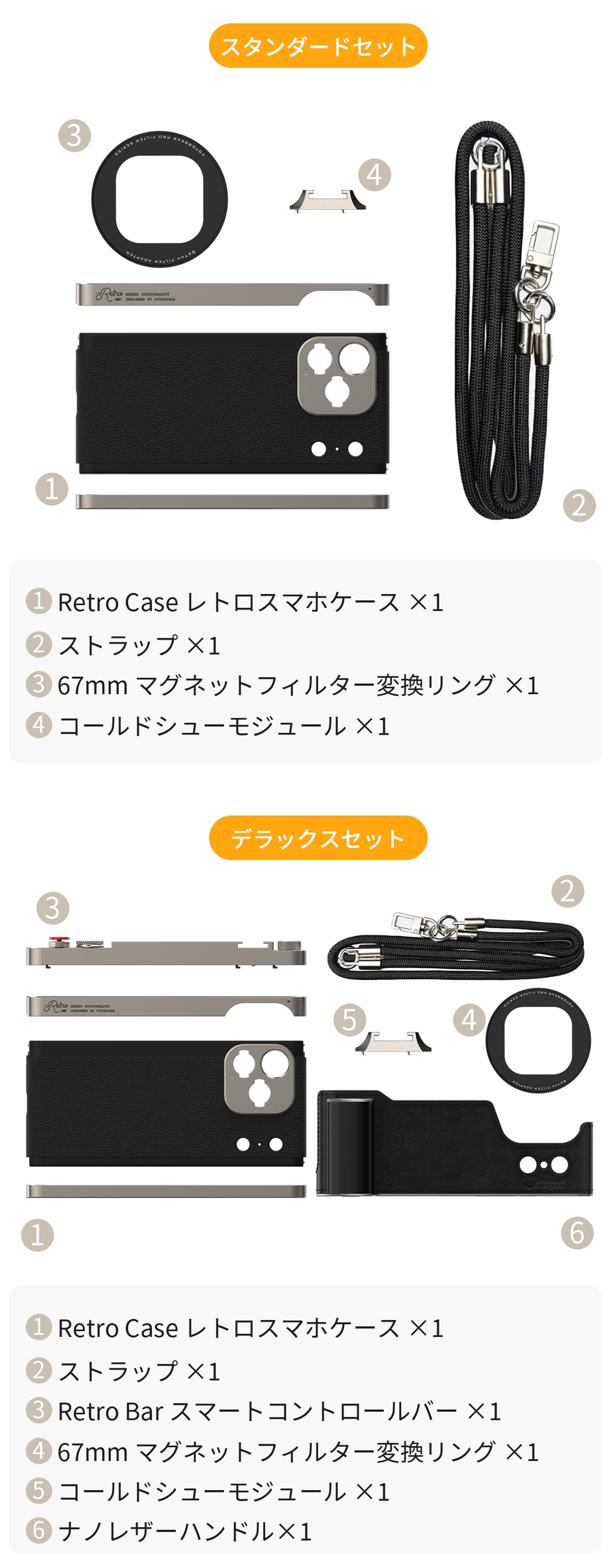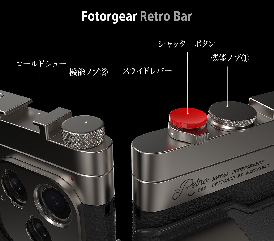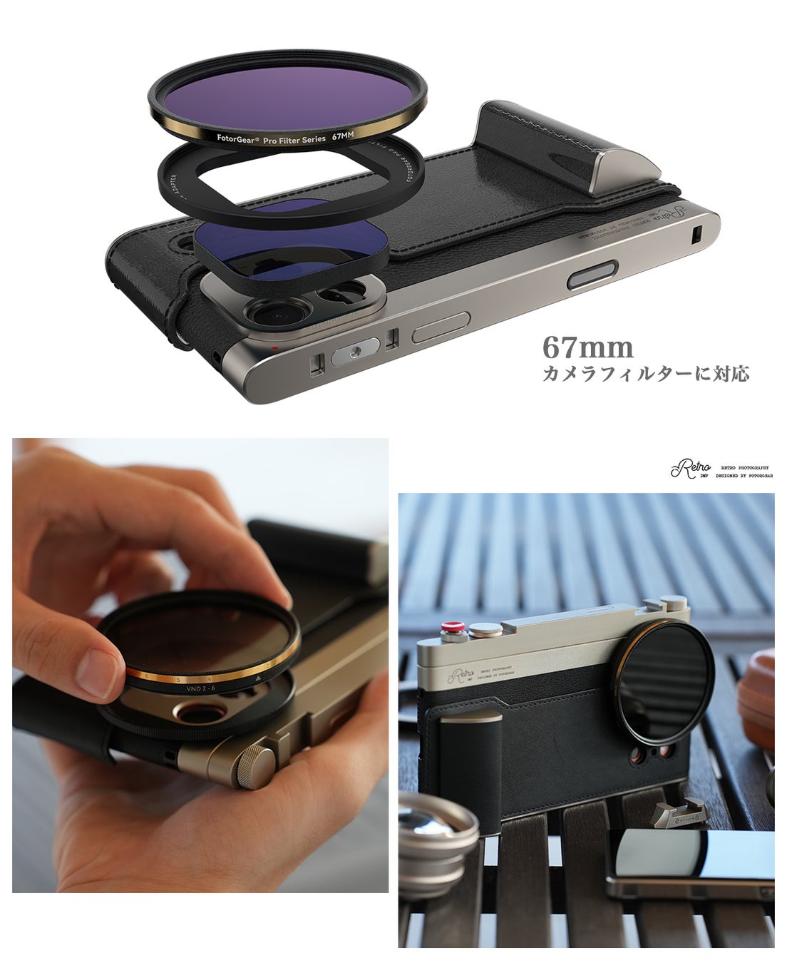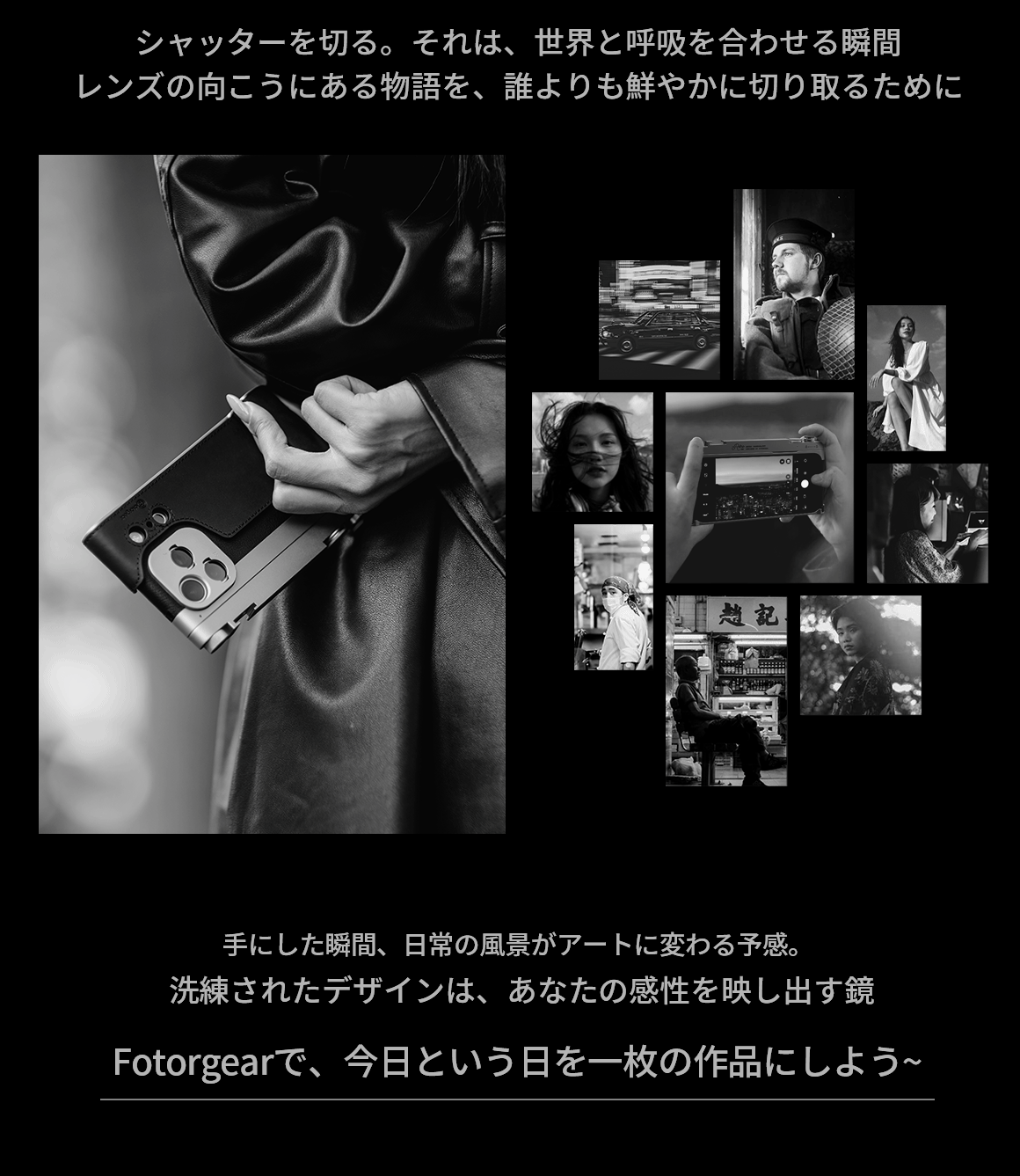 「Fotorgear Retro DMF」は、iPhoneの圧倒的な画質を最大限に引き出すために設計された、革新的な撮影ギアです。 アルミ合金製の堅牢なフレーム、手に馴染むレザーの質感、そして物理シャッターボタンとダイヤル操作。これらを装着するだけで、あなたのiPhoneは単なるスマートフォンから、「撮る悦び」を感じられる本格的なカメラへと進化します。