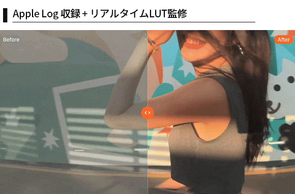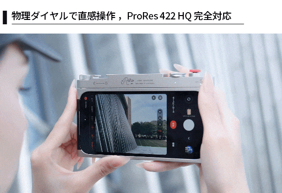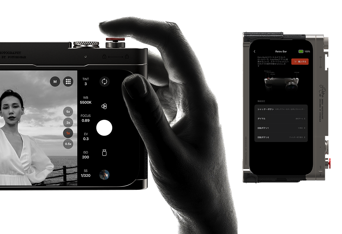 Bluetooth接続により、グリップ上部の物理シャッターボタンとダイヤルがiPhoneと連動。画面をタップすることなく、半押しフォーカスや露出補正が可能です。まるで往年のフィルムカメラのような操作感を実現しました。