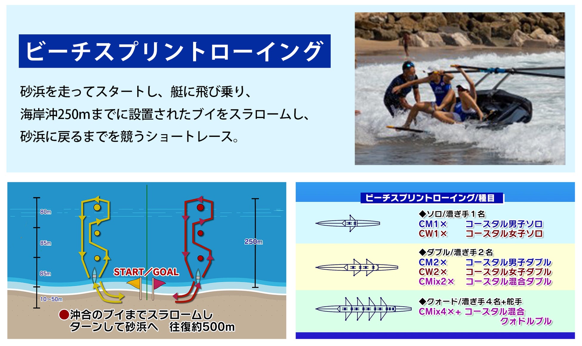 海をフィールドとした「コースタルローイング」の中でも砂浜のランを組み合わせたショートレースが「ビーチスプリントローイング」です。