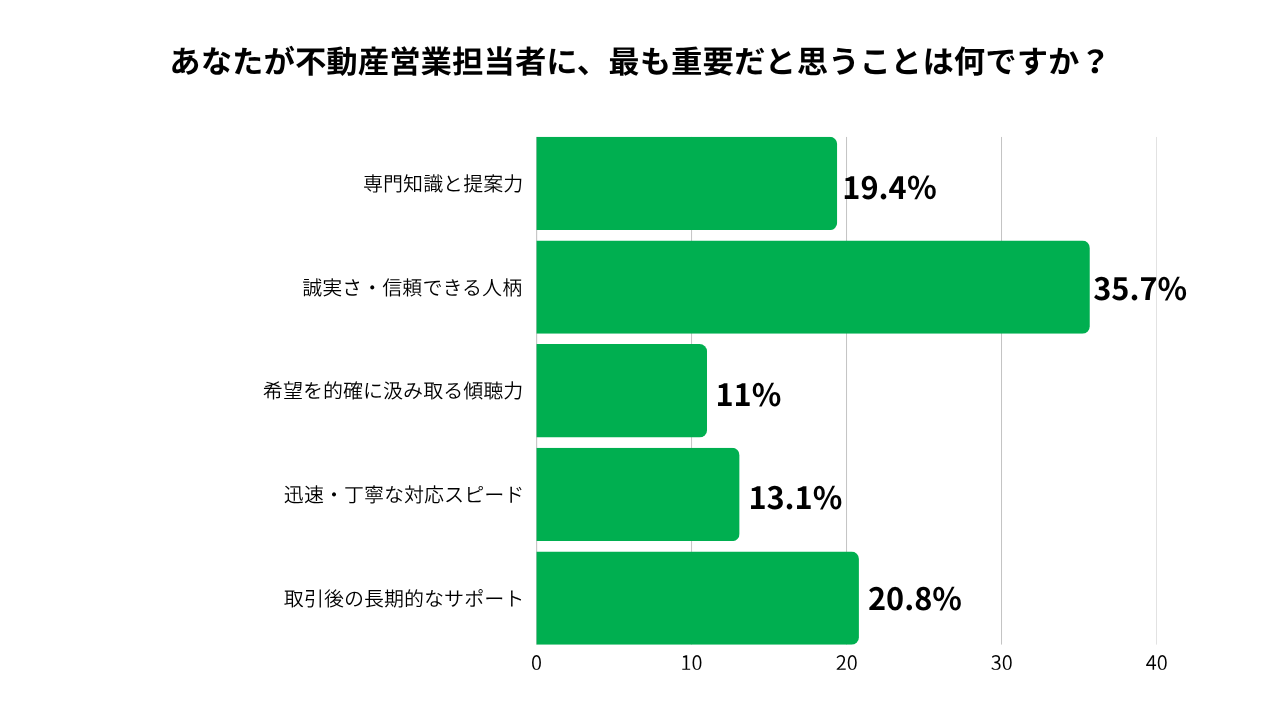 不動産営業担当者に求めるポイントを尋ねたところ、全世代共通で1位となったのは「誠実さ・信頼できる人柄(35.7%)」でした。不動産取引のように高額かつ専門性の高い意思決定では、“誰に任せるか”が最重要であることが再確認される結果となりました。続いて、2位「取引後の長期的なサポート(20.8%)」、3位「専門知識と提案力(19.4%)」が上位を占めました。