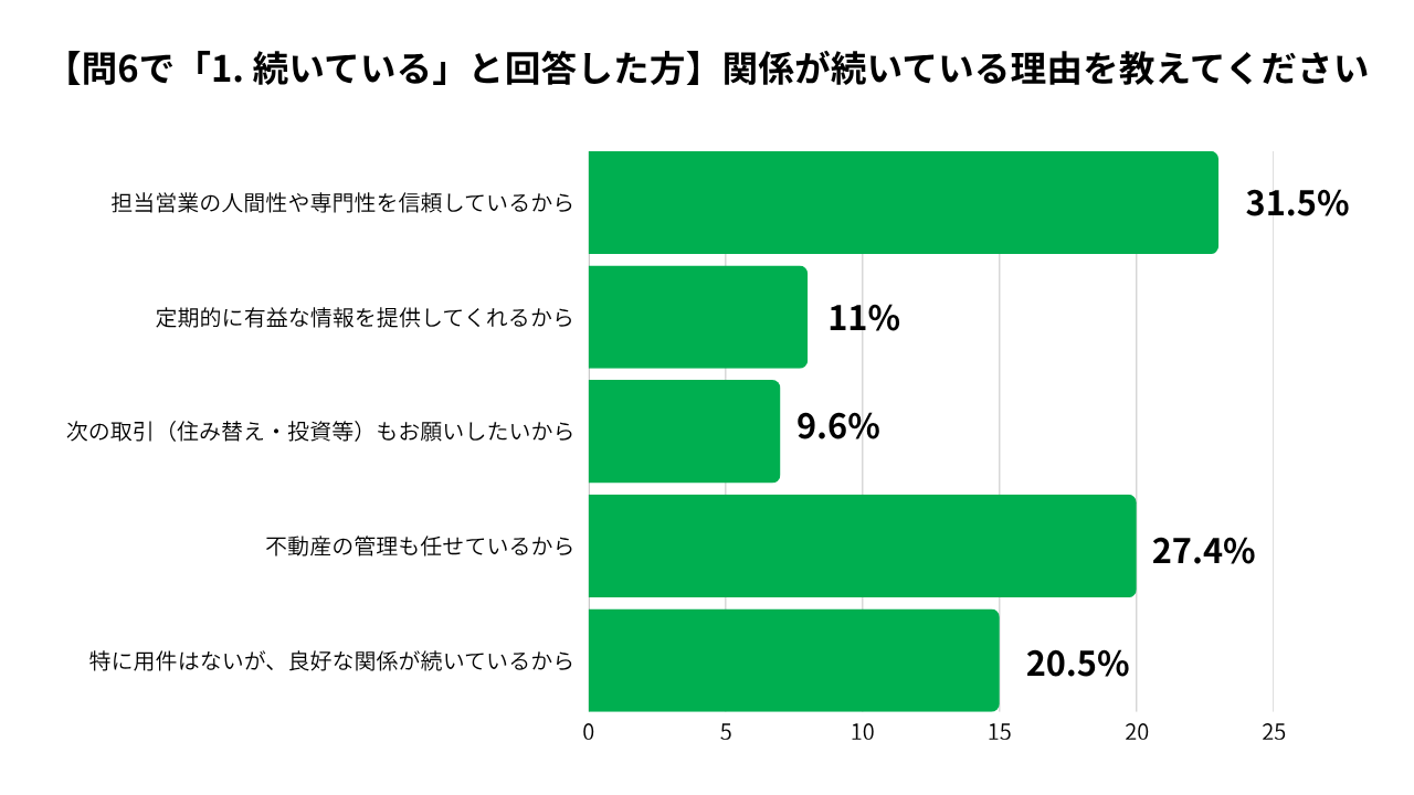 取引後も営業担当との関係が続いていると回答した人は13.4%に留まり、不動産取引が“一度きりの関係”で終わるケースが大半であることが明らかになりました。