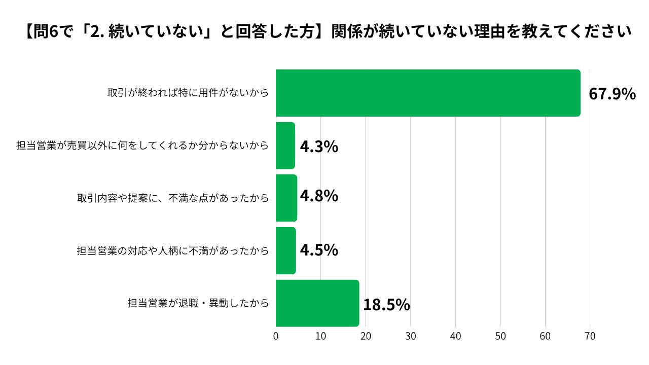 関係が続く理由として最も多かったのは、「担当営業の人間性や専門性を信頼しているから(31.5%)」で、担当者の“人柄・信頼性”が継続的な関係構築の核心であることが示されました。一方、関係が続かない理由の最多は「取引が終われば特に用件がないから(67.9%)」でした。