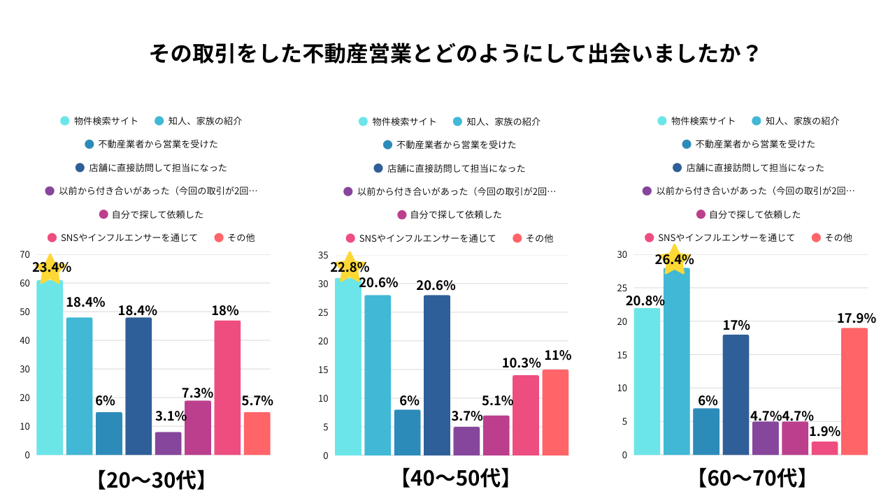 一方で、世代別に見ると明確な差が浮き彫りになっています。20〜30代では、「SNSやインフルエンサーを通じて」出会った割合が18% に達し、40〜50代(10.3%)、60〜70代(1.9%)と比較して突出した結果となりました。SNSに触れる時間が長い若年層ほど、不動産営業との接点もオンライン化する傾向が強く、「不動産は紹介か検索サイトで探すもの」という従来の常識が世代によって大きく変わり始めていることが読み取れます。