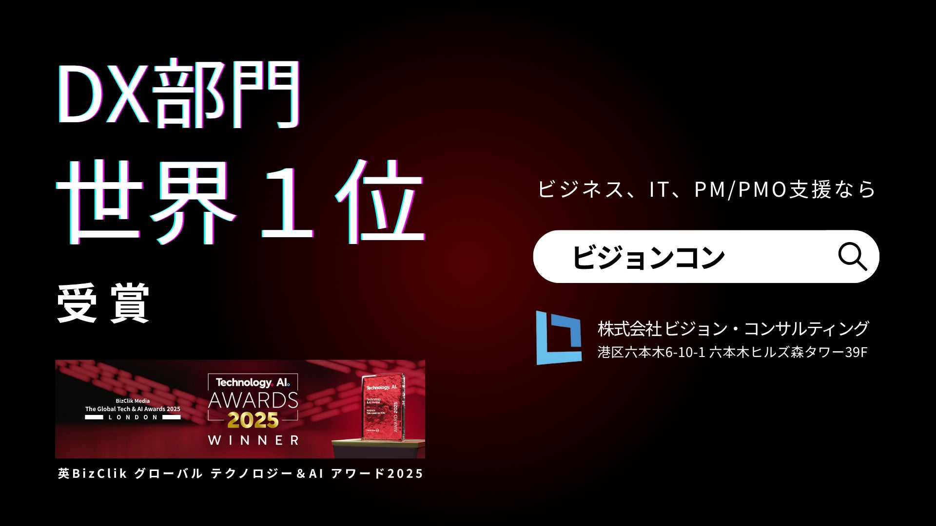 戦略・ITに強い総合系コンサルティングファームのビジョン・コンサルティング(従業員数:1373名 本社:六本木ヒルズ森タワー39階 *2025年6月時点 )が、イギリス・ロンドンで開催された世界的AIアワード「The Global Tech & AI Awards 2025」Digital Transformation Award(DX部門)でWinner(世界1位)を受賞。単なる戦略提案に留まらず、経営課題の本質に踏み込み、現場での実行と業務定着を伴走支援する「実行力」こそが、世界や大手企業の多くのクライアントから高く評価されています。構想で終わるDXに限界を感じている皆さまへ。成果創出にこだわる、世界が選んだ支援がここにあります。
