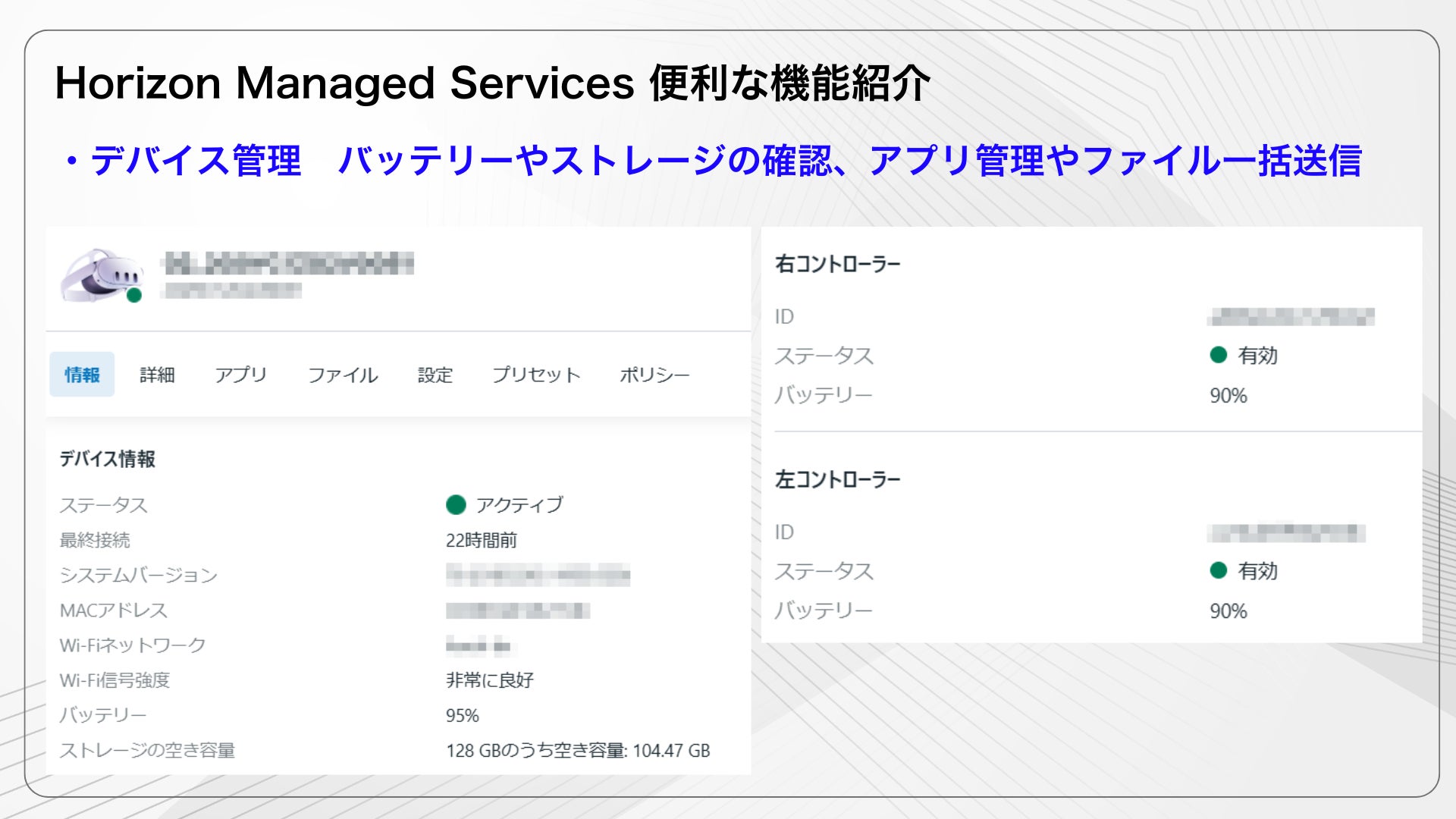 管理者は、登録したデバイスの状態を確認することが出来ます。バッテリーやストレージといったデバイス情報を確認したり、各端末やグループ毎に割り当てるアプリを管理したり、画像・動画・ドキュメントファイルなどを一括送信できます。