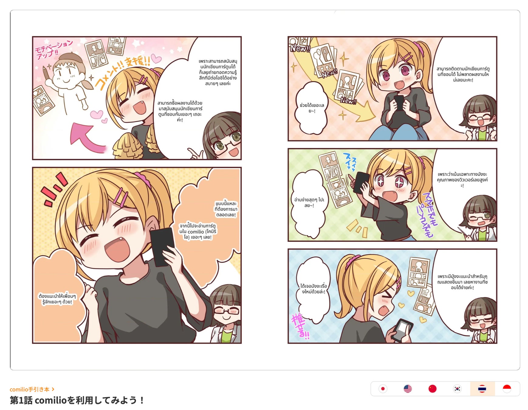 今回、新たにタイ語・インドネシア語対応を正式リリースいたします。今後は、人気漫画家と、タイの国民的女優によるスペシャルコラボ漫画をタイ語版・日本語版の両方で「comilio」にて同時公開も予定しています。