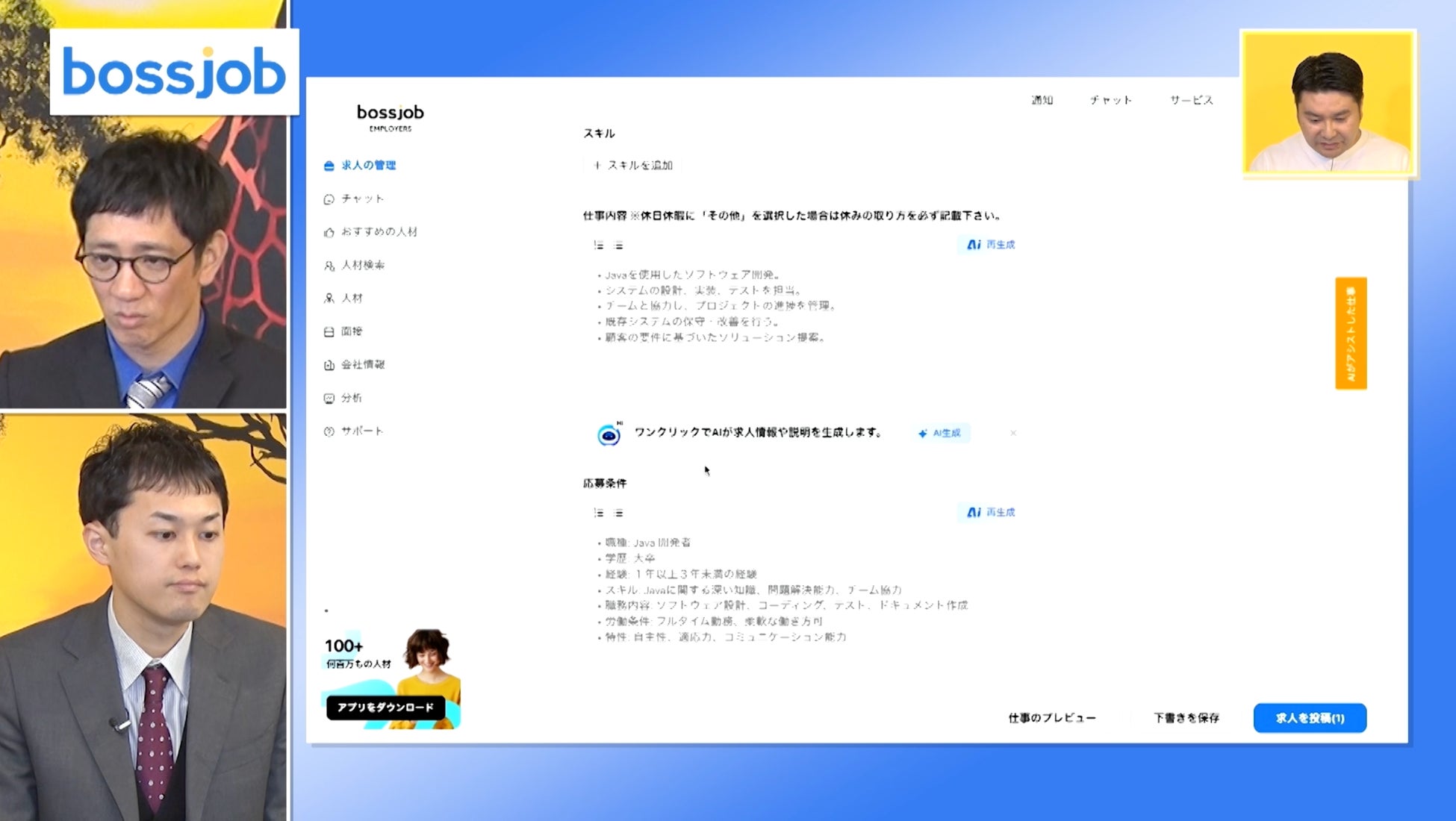 bossjobは高性能なAIが搭載されており、求人内容の自動生成・AIにより人材マッチング・AIによる書類選考の自動化など採用業務の効率化を実現出来ます。番組内ではAIによる求人自動生成の機能を実際にデモンストレーションしています。