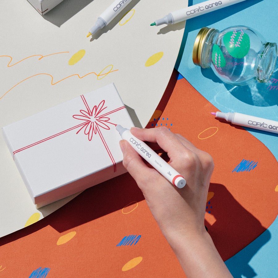 「コピック アクレア」は、水性顔料インクのカラーマーカーで、紙はもちろん金属、木、ガラス、プラスチックなど様々な素材に描くことができるマーカーです。