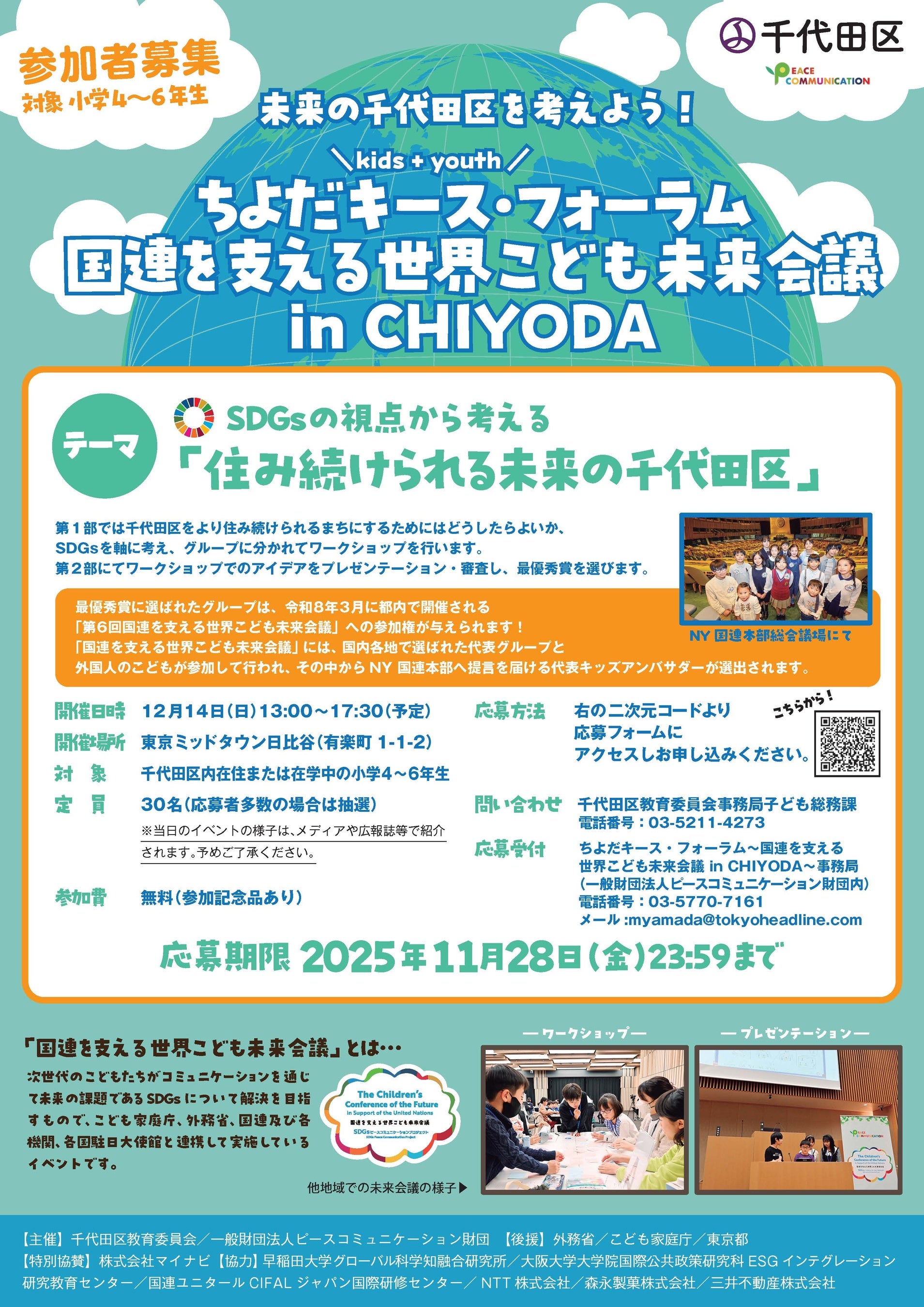一般財団法人ピースコミュニケーション財団は、東京都千代田区の小学校に通う4~6年生を対象にした「ちよだキース・フォーラム~国連を支える世界こども未来会議 in CHIYODA~」を東京ミッドタウン日比谷にて開催します。