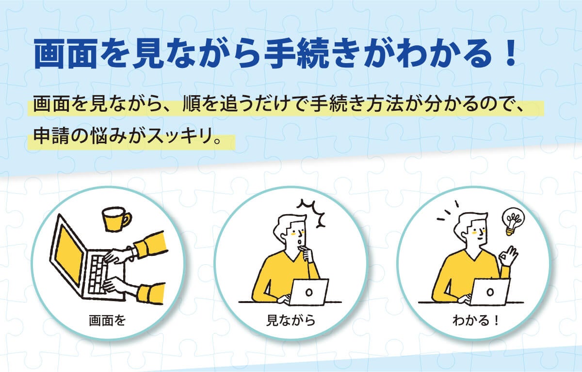 :画面を見ながら、順を追うだけで手続き方法がわかるので、申請の悩みがスッキリ。
