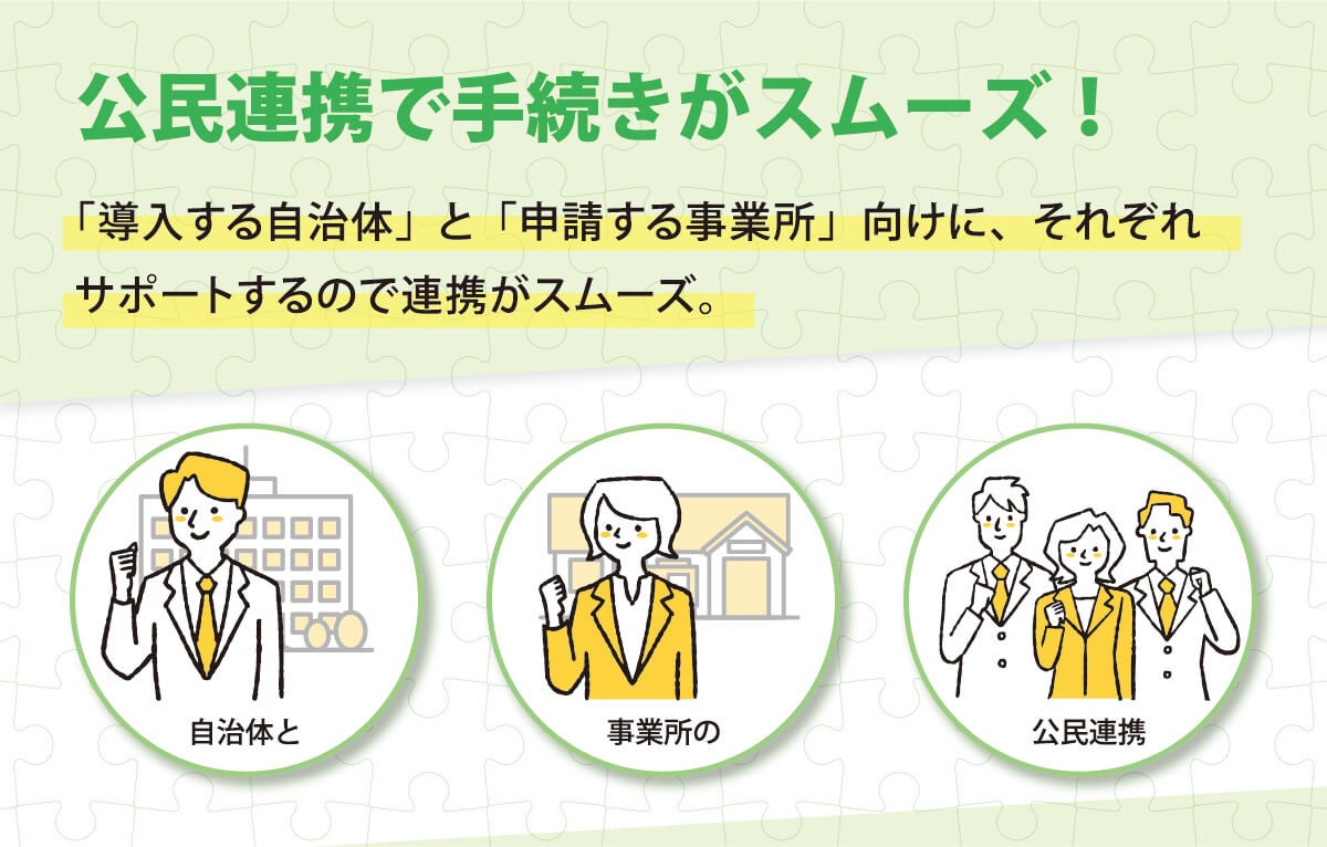 :「導入する自治体」と「申請する事業所」向けに、それぞれサポートするので連携がスムーズ。