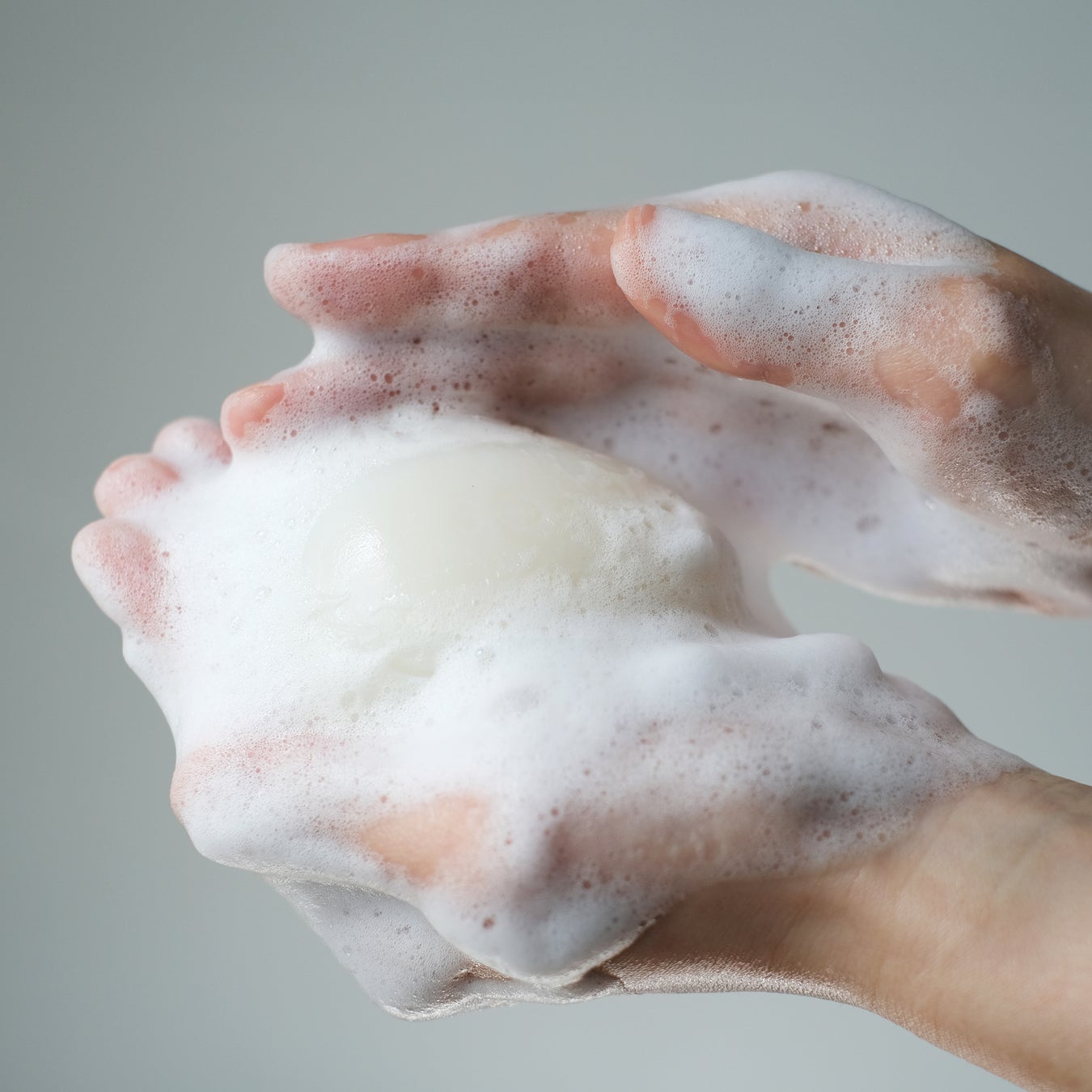 洗うアイテムは、固形石けんの「モイスチャーベビーソープ」と、ポンプ式の「モイスチャーフォーミングベビーウォッシュ」の2種類をご用意しました。乳幼児用の洗浄料には弱酸性が多いなか、マークスアンドウェブでは、汗や皮脂、よだれなど、弱酸性傾向にある汚れをきちんと落として清潔に保つことを重視し、弱アルカリ性の処方を採用しています。石けんベースのため、泡切れがよくすすぎに時間がかからないのも特長です。