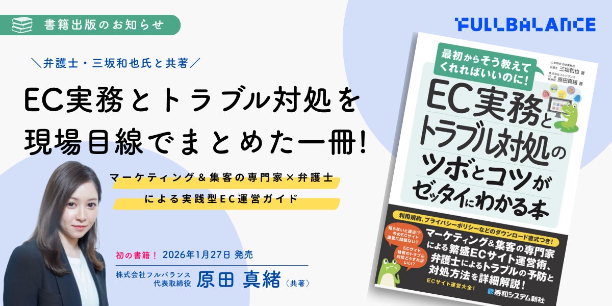 株式会社フルバランス(以下、当社)代表取締役の 原田真緒 が、弁護士の 三坂和也 氏との共著により、書籍 EC実務とトラブル対処のツボとコツがゼッタイにわかる本 を2026年1月27日に発売いたしました。