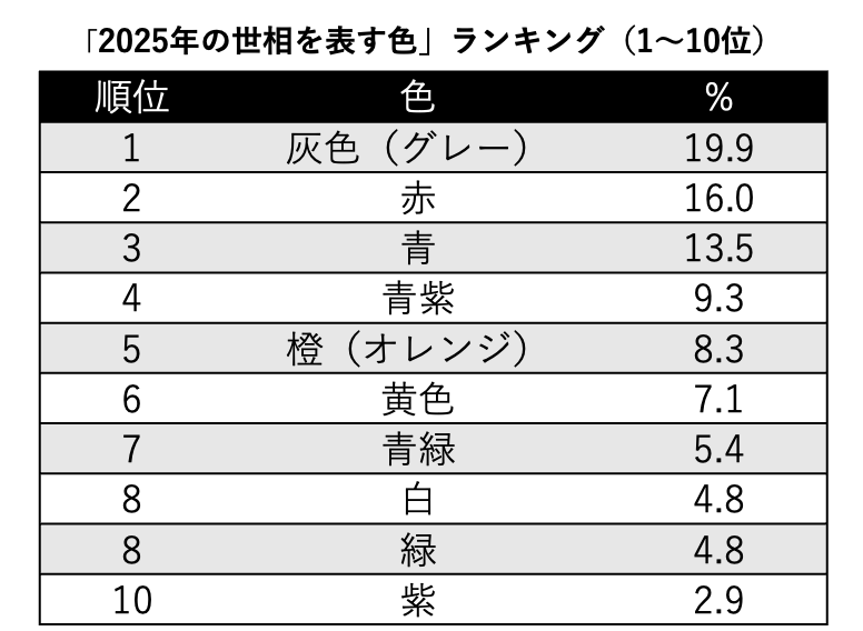 「2025年の世相を表す色」は灰色(グレー)と回答した人が約20%と最も多く、国際情勢や災害、物価高などが理由に挙がり、不透明感が強い一年を示す結果となりました。