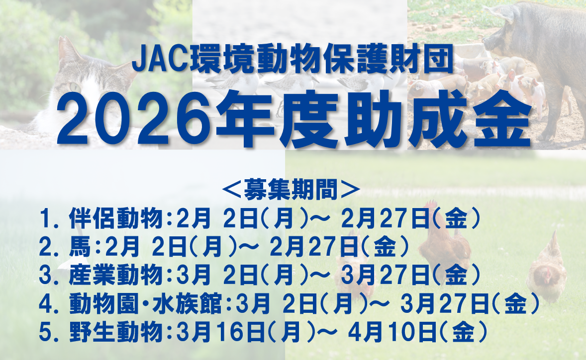 公益財団法人JAC環境動物保護財団では、日本における動物福祉の向上と動物保護、それに伴う自然環境保護を目的とした活動に対して助成を行っております。