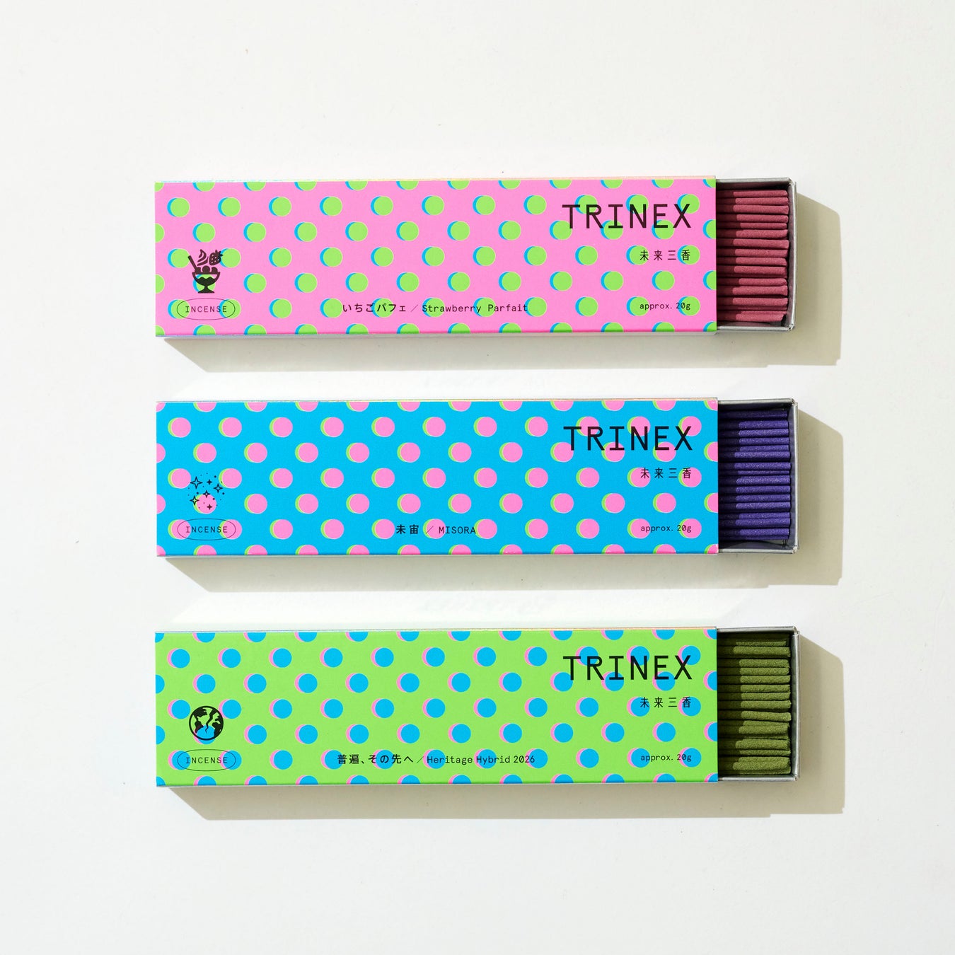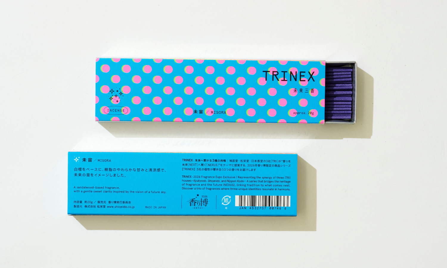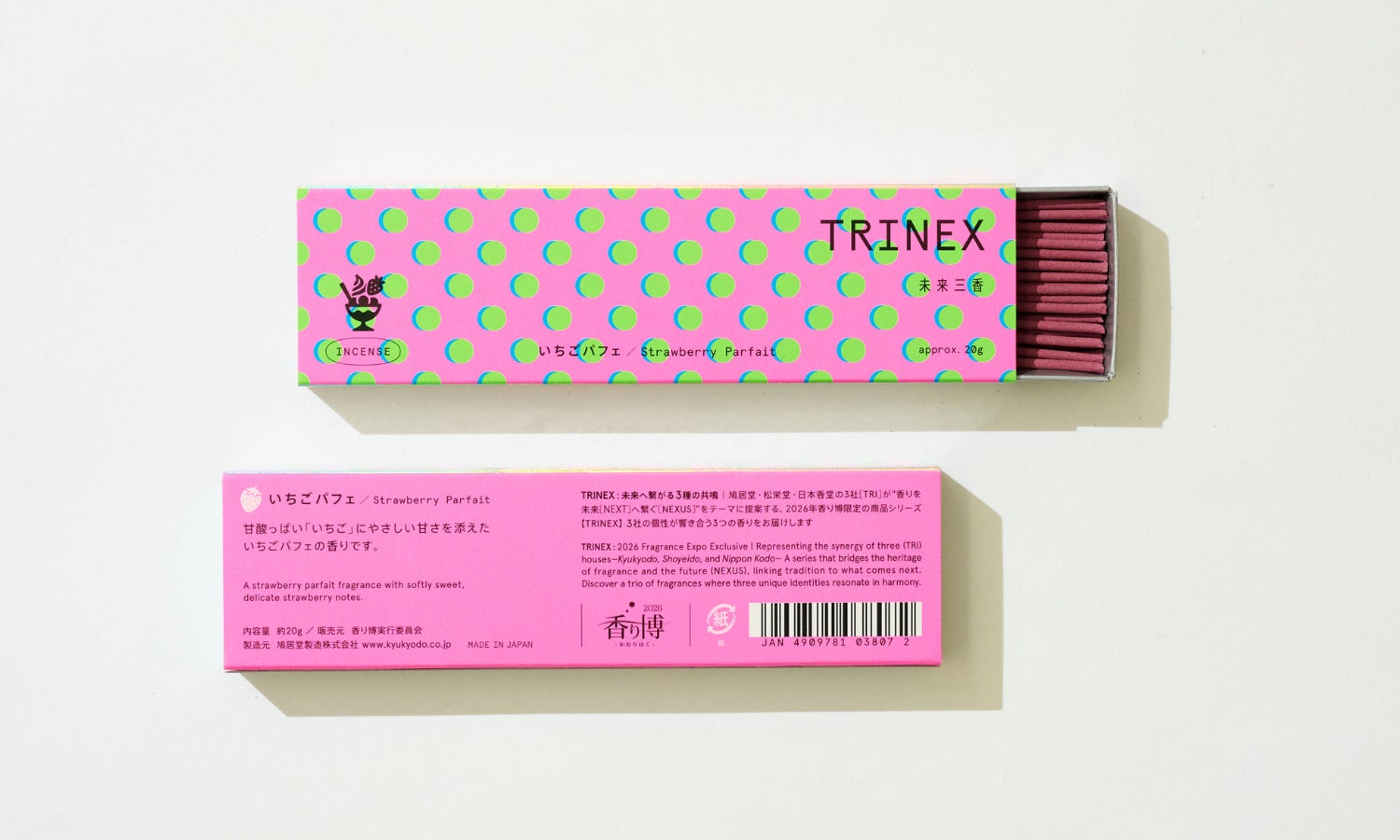 「TRINEX〈未来三香〉」は、香り博2026のテーマ「明日につなげる香り -Where Scents Meet Tomorrow-」をもとに、鳩居堂・松栄堂・日本香堂の3社(TRI)が、“香りを未来(NEXT)へ繋ぐ(NEXUS)”をコンセプトに共同開発した限定シリーズです。