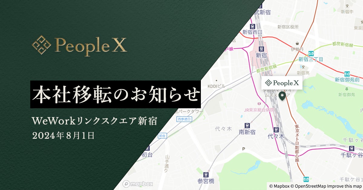 エンプロイーサクセス事業を推進する株式会社PeopleX(本社:東京都渋谷区、 代表取締役 兼 CEO:橘 大地、以下:当社)は、2024年8月1日よりWeWorkリンクスクエア新宿に本社オフィスを移転することをお知らせいたします。