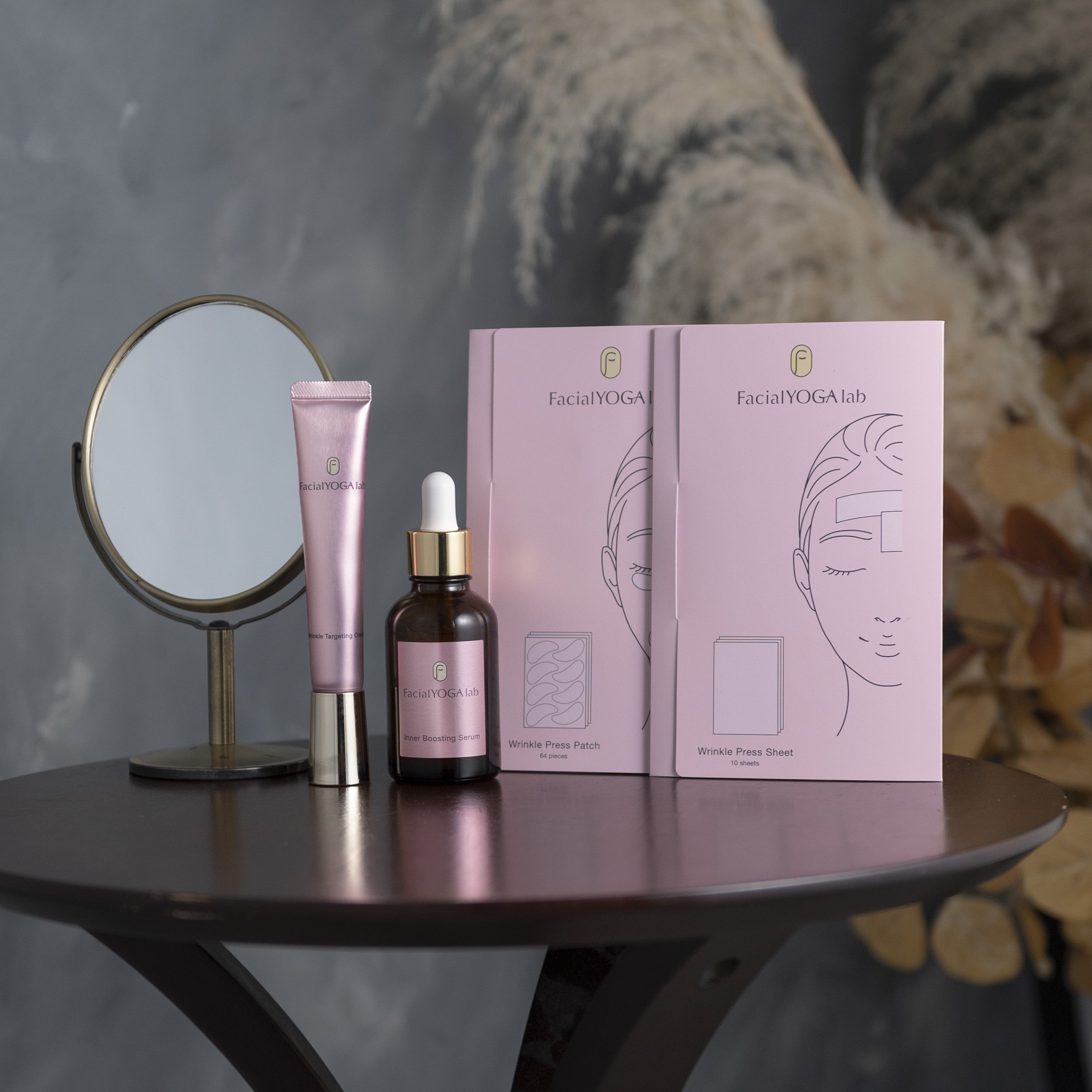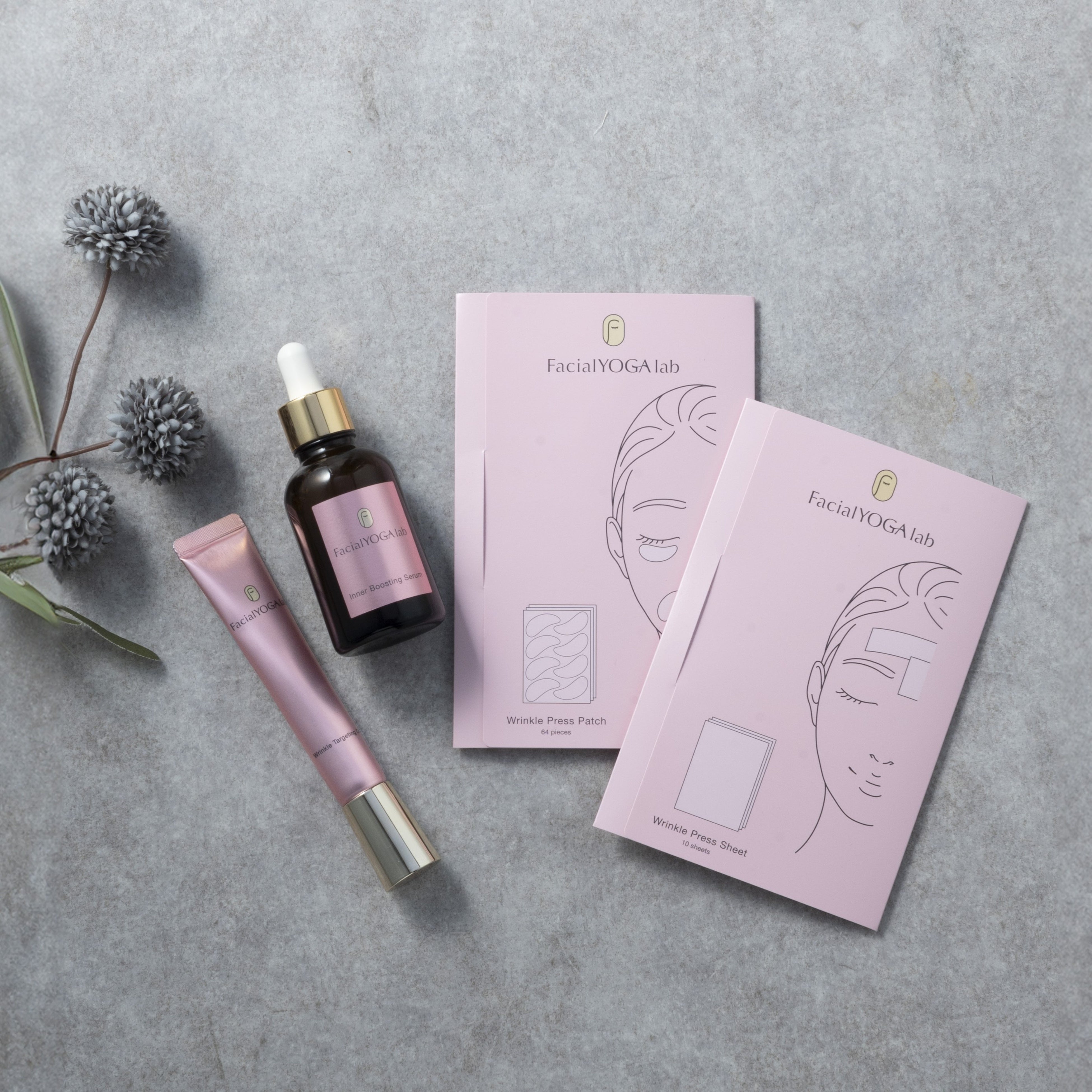 FacialYOGA Labの薬用スキンケア2品とリンクルプレス(試供品)・次回購入クーポンに、顔ヨガオンラインレッスンが無料で付いた数量限定の全4種類のセット