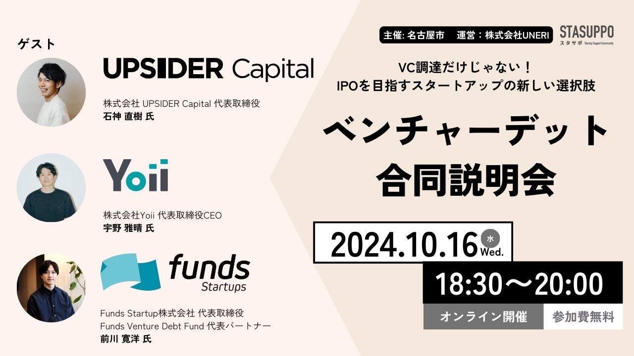Funds Startups株式会社(本社:東京都渋谷区、代表取締役:前川寛洋、以下 当社)は、名古屋市が運営するスタートアップ支援コミュニティ「STASUPPO|スタサポ(以下、スタサポ)」の第3回イベント、『VC調達だけじゃない!IPOを目指すスタートアップの新しい選択肢「ベンチャーデット」合同説明会』に、代表の前川が登壇することをお知らせいたします。