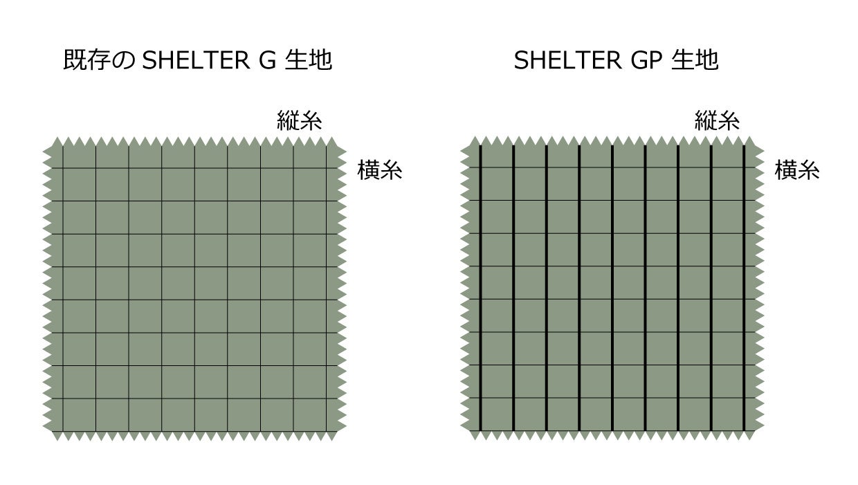 SHELTER GPはナイロン40D 260T H/B / Silicone / PU Coating耐水圧2,000㎜で、既存のSHELTER Gの生地よりも縦糸を厚くして張力を高め、耐久性を強化したスキンにアップグレードしました。