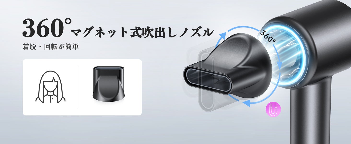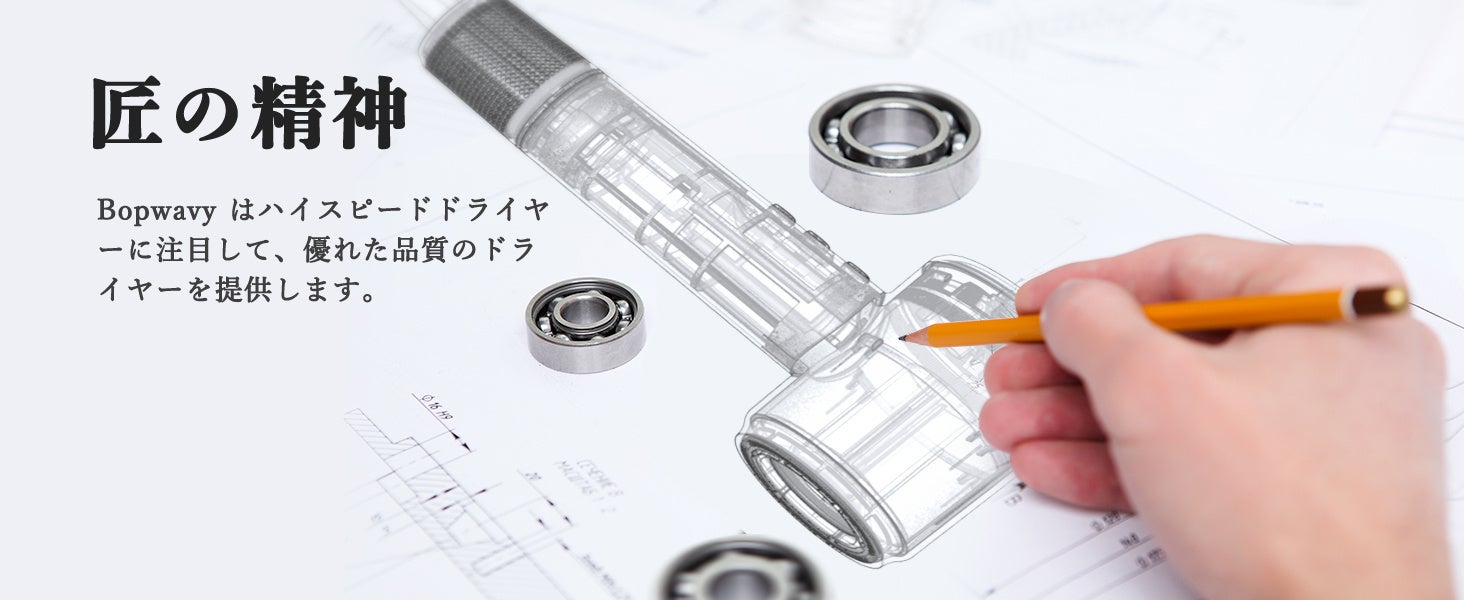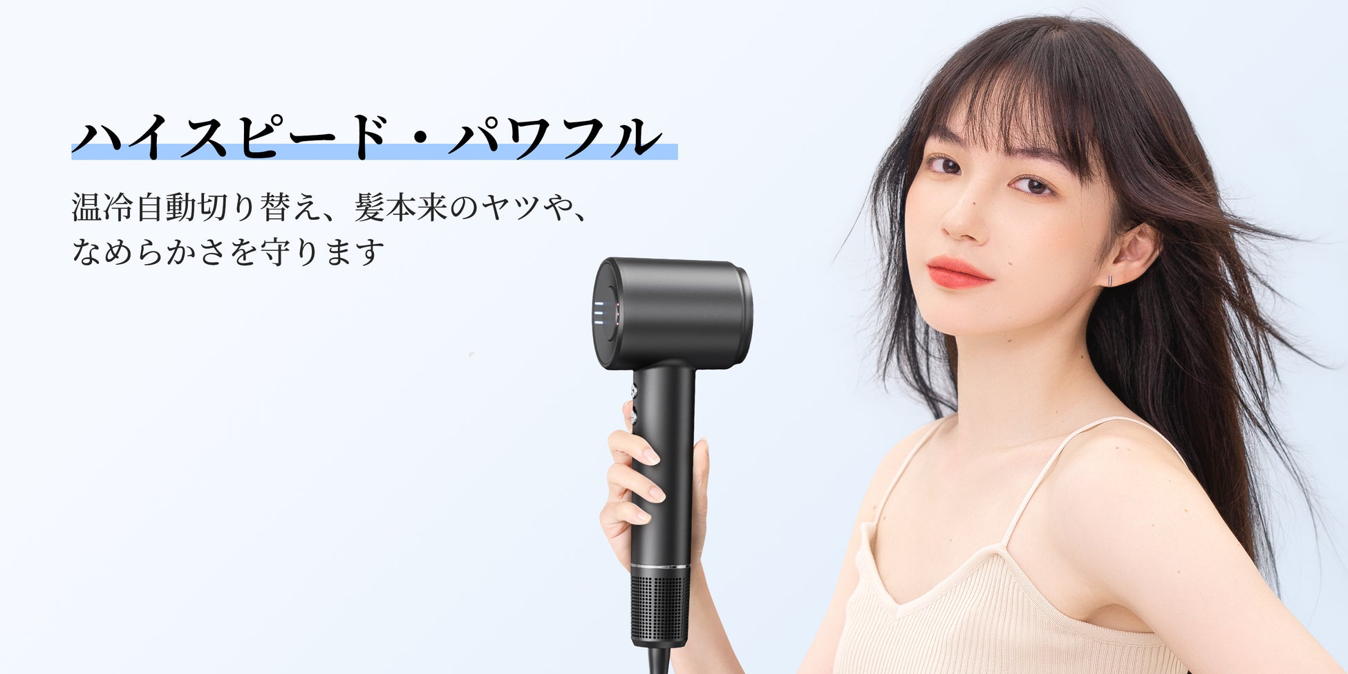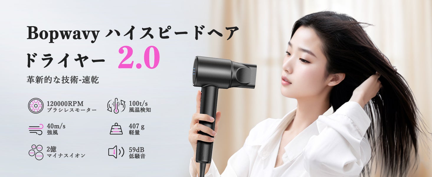 製品:「Bopwavy」マイナスイオンドライヤーは高速モーターが内蔵され、毎分120,000の高速回転を生成、パワフルな風を送る同時に髪に水分を補給します。