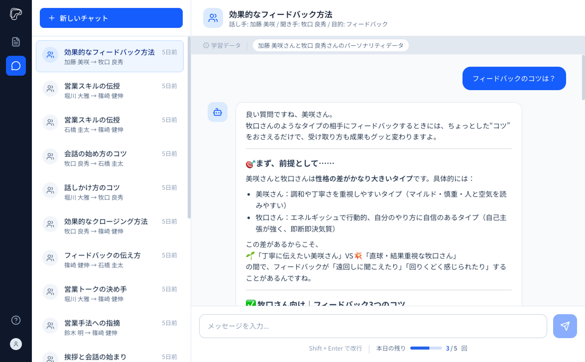 転職エージェントと求職者それぞれのパーソナリティを学習したAIに、向き合い方をチャットで相談可能。