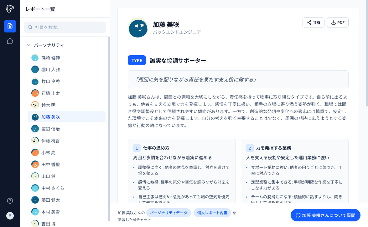 診断回答をもとに、求職者のパーソナリティレポートを生成。