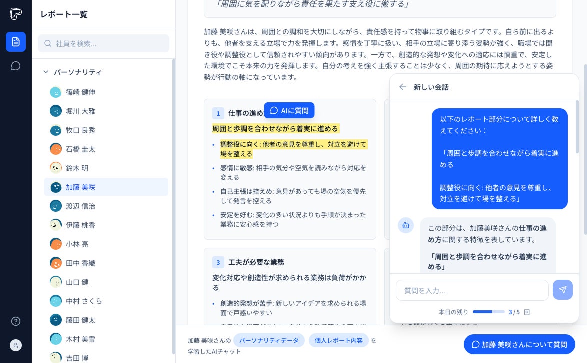 求職者のパーソナリティレポートと診断結果を学習したAIにチャットで質問が可能。