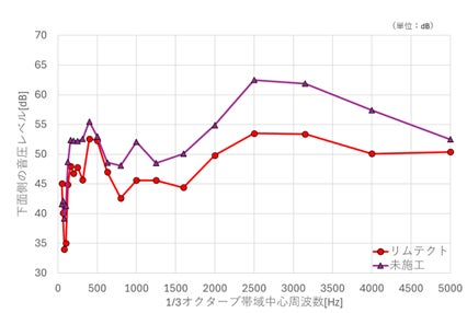 ISO10140-5 :2021に準拠した降雨騒音試験の結果、リムテクト工法を折板屋根に施工した場合、最大10dbの騒音抑制効果を確認しました。