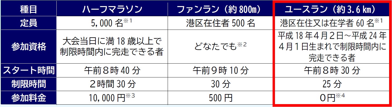 子どもから高齢者まで、国籍、障害の区別なく、多くの区民が参画できるスポーツを通じた地域共生社会を実現するため、令和6年11月17日(日曜)にMINATOシティハーフマラソン2024を開催します。今大会では、 新たに中学生・高校生向けの種目(ユースラン)をテストイベントとして実施します。