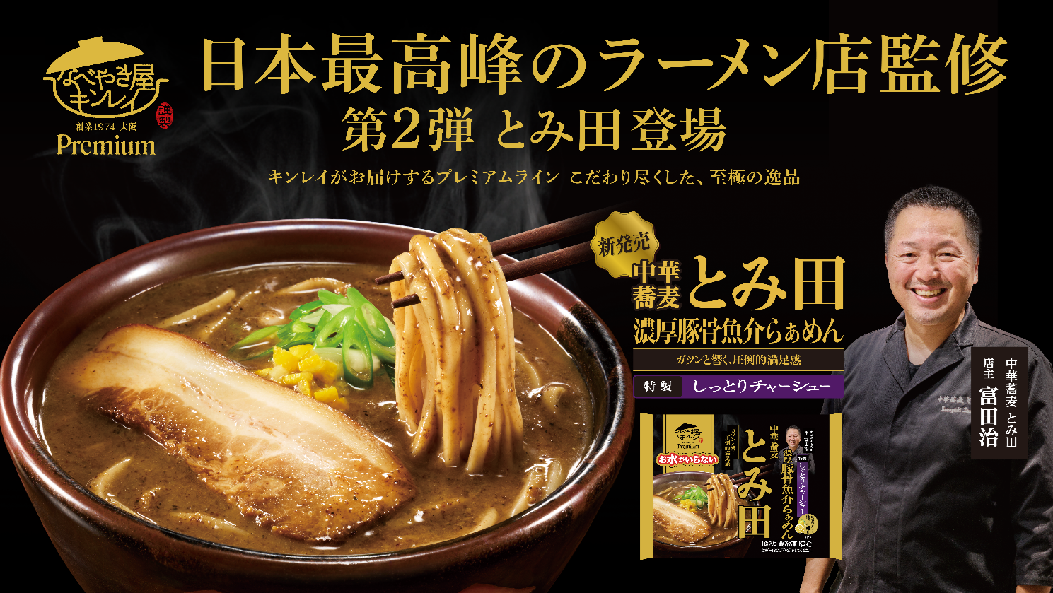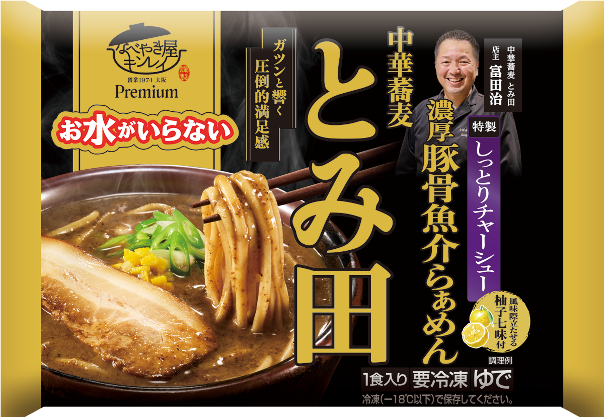 本商品は、創業50周年を迎えた新たな取り組みとして2025年に発売した、“こだわり尽くした至極の逸品”をコンセプトとするプレミアムライン「お水がいらないプレミアム」の第2弾となる新商品。千葉県松戸市が誇る名実ともに日本最高峰のラーメン店「中華蕎麦とみ田」監修のもと、全国の皆様にご家庭で簡単に専門店さながらの「特別なおいしさ」をお届けします。